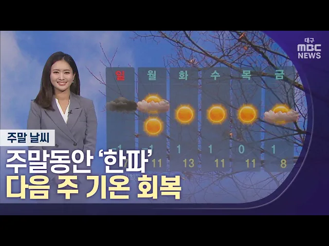 1아침부터 동장군이 찾아왔습니다.외출하실 때 옷차림을 단단히 해주셔야겠는데요. 북서풍을 따라 찬 공기가 강하게 남하하면서, 우리지역 기온이 큰 폭으로 떨어졌습니다. 현재 대구의 기온 6도 보이고 있는데요. 바람까지 강하게 불어 체감추위는 더 춥게 느껴지겠습니다.오늘 낮 기온 2도 예상 되고요. 한파의 영향으로 ...