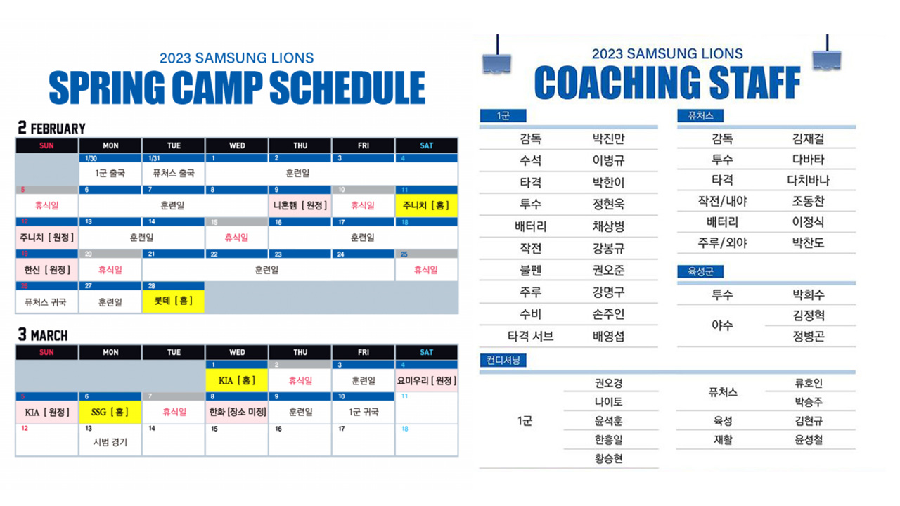 2월부터 일본 오키나와에서 2023시즌 스프링캠프를 펼칠 예정인 삼성라이온즈가 현지에서 9차례의 연습경기를 펼칠 예정입니다.1월 30일 출국해 3월 12일까지 42일간 오키나와에서 본격적인 개막 준비에 나서는 삼성은 현지에서 국내 KBO리그 팀들은 물론, 일본 현지 팀들과도 맞대결을 치릅니다. 대부분의 국내 팀이 미국 ...