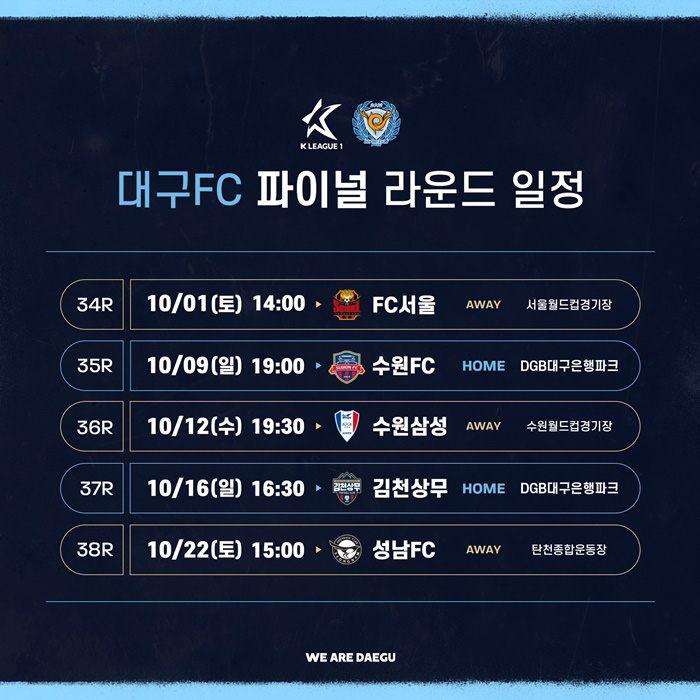 10월부터 5번의 마지막 승부를 남겨둔 대구FC의 하나원큐 K리그1 2022, ‘파이널 라운드' 일정과 대진이 공개됐습니다.10월 1일, 34라운드를 시작으로 모두 5경기를 펼치는 대구FC는 10월 9일 저녁 7시 수원FC와의 맞대결과 16일 오후 4시 반 김천과의 37라운드를 홈에서 펼칩니다.1일 FC서울과 12일엔 수원삼성과 원정 경기...