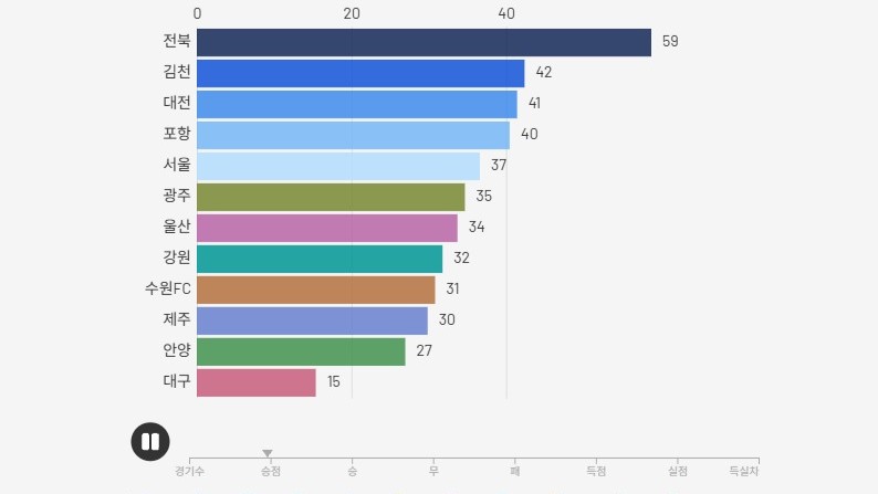 A Flourish bar chart race이번 시즌 최다 득점 경기와 함께 화끈한 승리를 거둔 김천상무가 리그 2위 자리도 되찾았습니다.8월 17일 저녁 김천종합운동장에서 펼쳐진 하나은행 K리그1 2025 FC서울과의 26라운드에서 김천은 무려 6골이나 기록한 화끈한 공격력에 힘입어 6-2 승리와 함께 5경기 연속 무패를 기록합니다. 서...