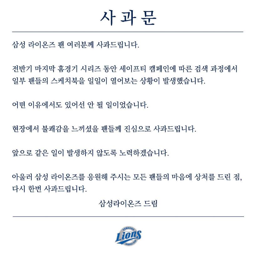 성적 부진에 대한 삼성라이온즈 팬들의 항의 시위가 예정된 가운데 삼성이 스케치북 논란에 대해 사과문을 발표했습니다.삼성은 포항에서 펼쳐진 한화와의 3연전을 마친 어제(28일) 밤 구단 공식 SNS에 이달 초 논란을 불러왔던 스케치북 검열에 대해 사과문을 올렸습니다.삼성은 "세이프티 캠페인에 따른 검색 과정에서 일...