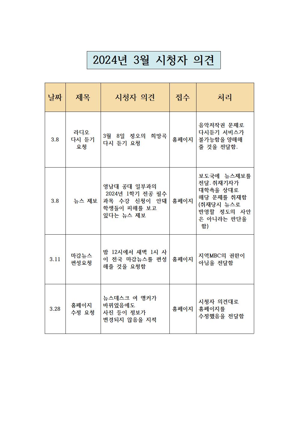 2024년 3월 시청자 의견 접수 및 처리 현황