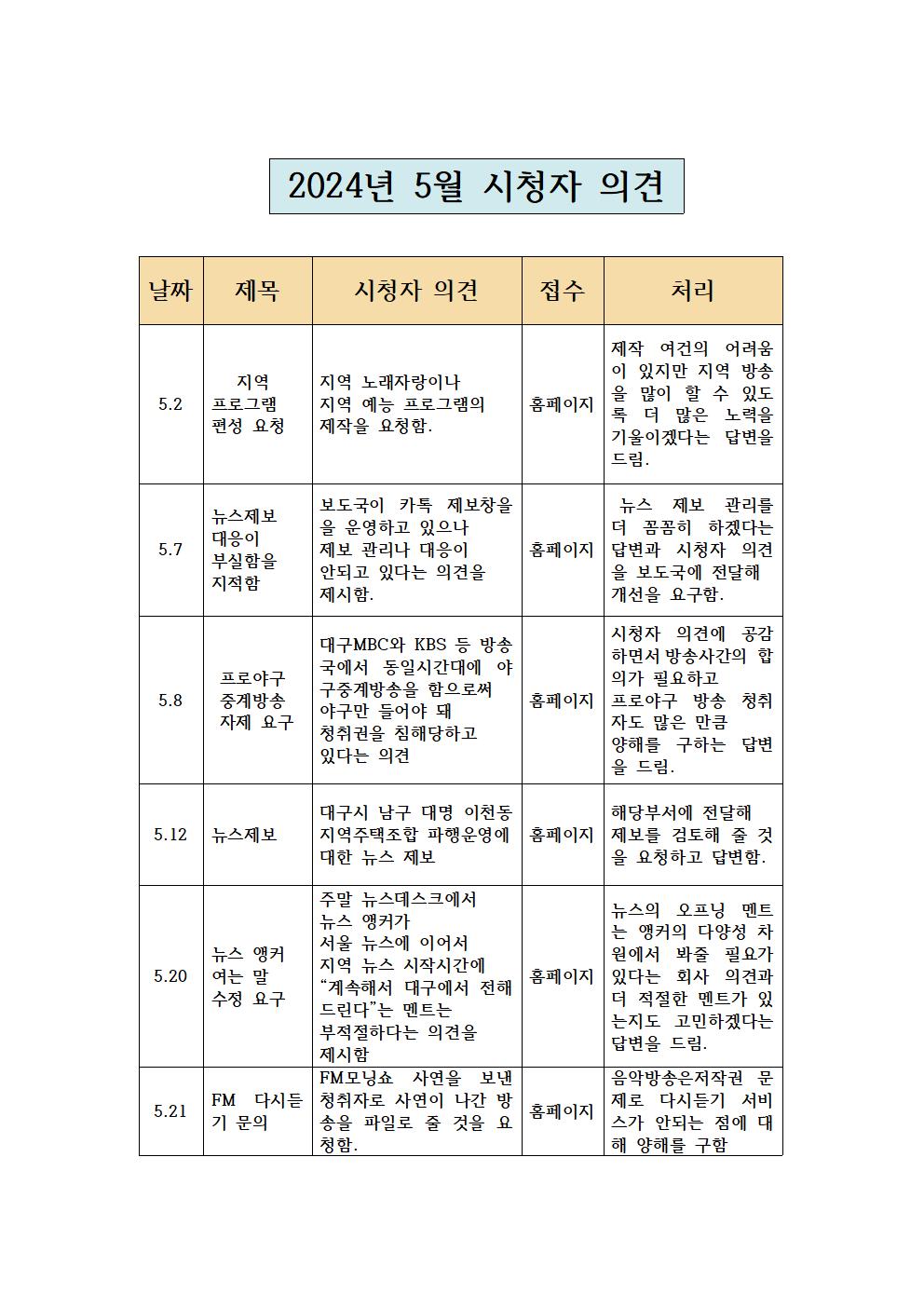 2024년 5월 시청자 의견 접수 및 처리 현황