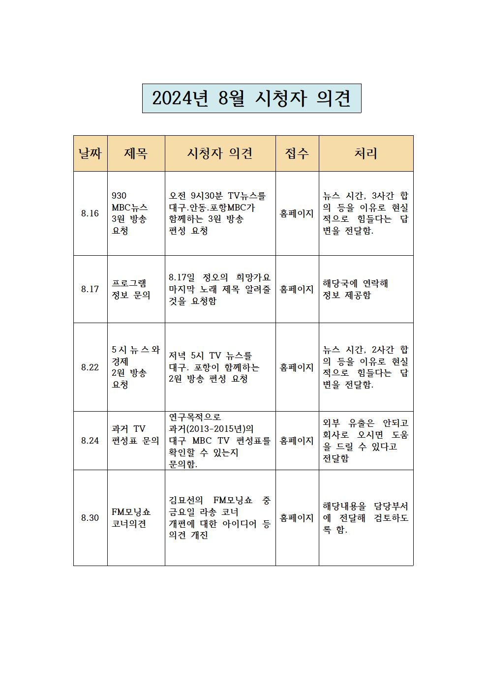 2024년 8월 시청자 의견 접수 및 처리 현황