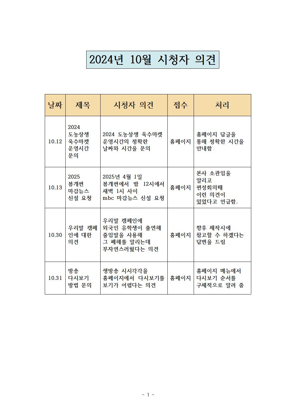 2024년 10월 시청자 의견 접수 및 처리 현황