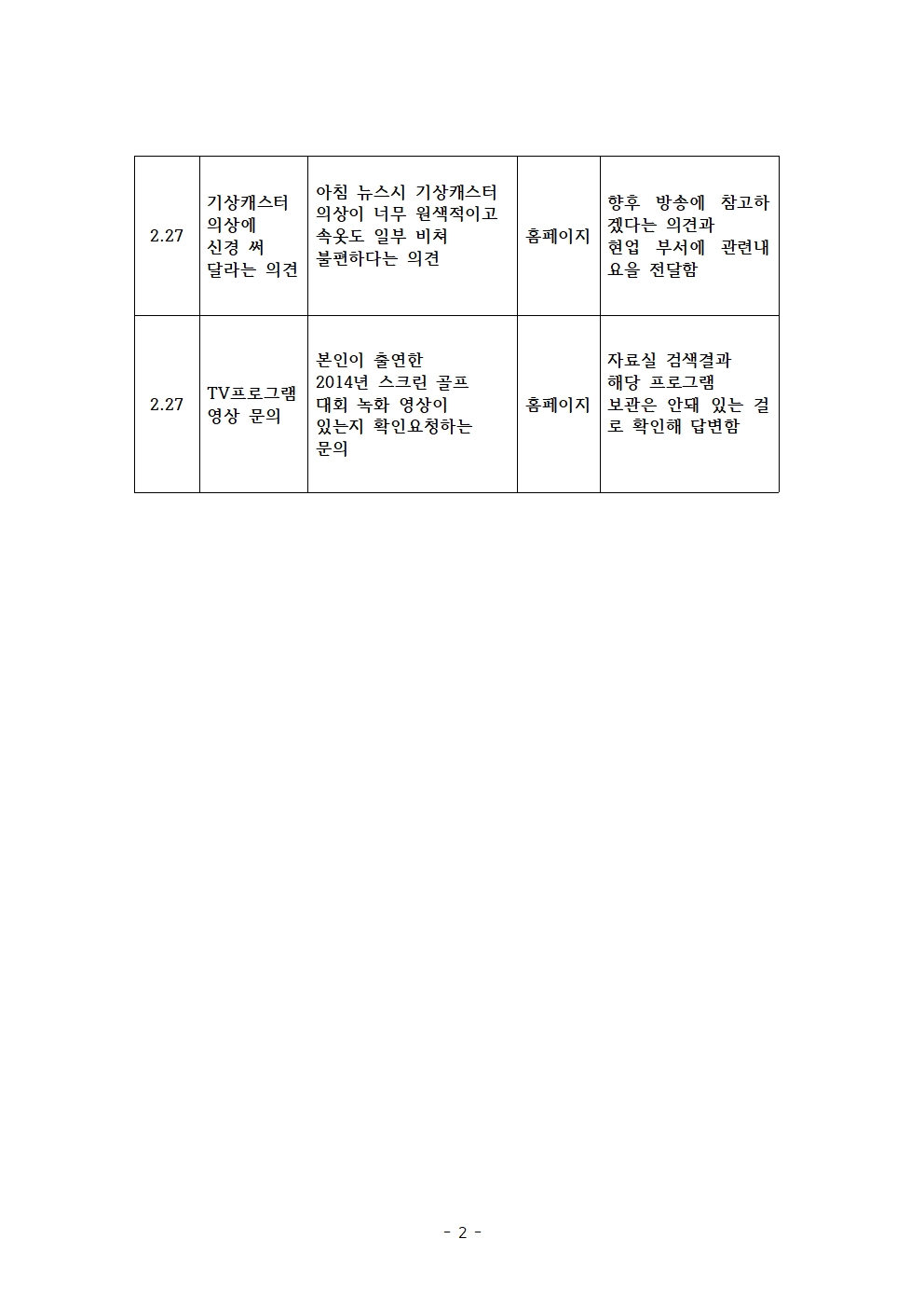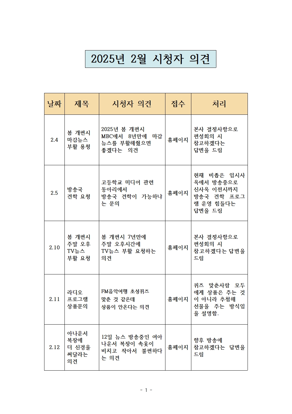 2025년 2월 시청자 의견 접수 및 처리 현황