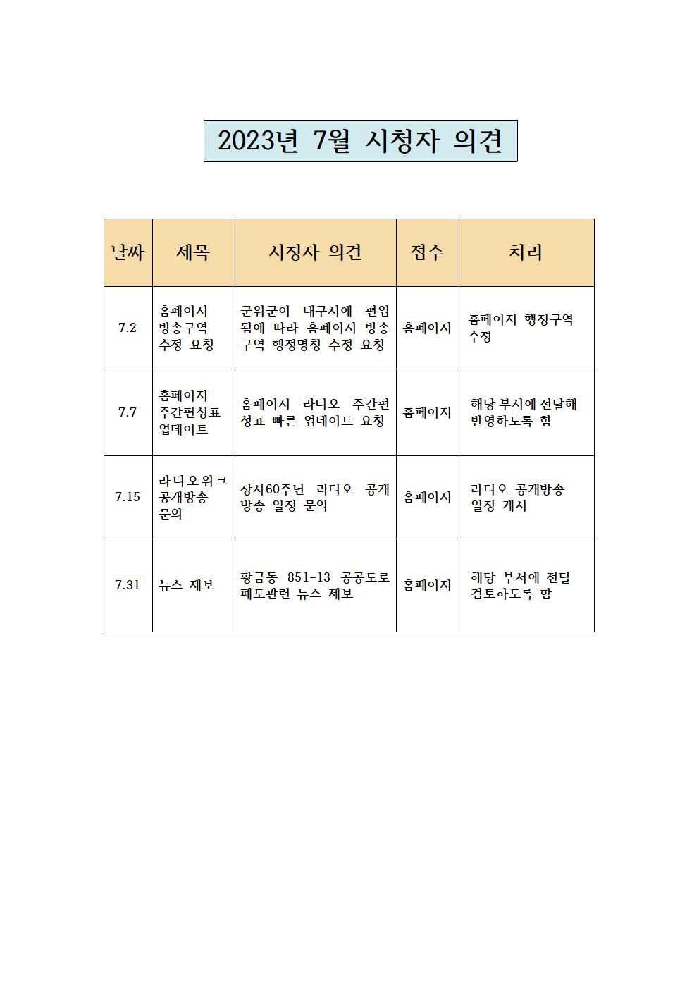 2023년 7월 시청자의견 접수 및 처리 현황