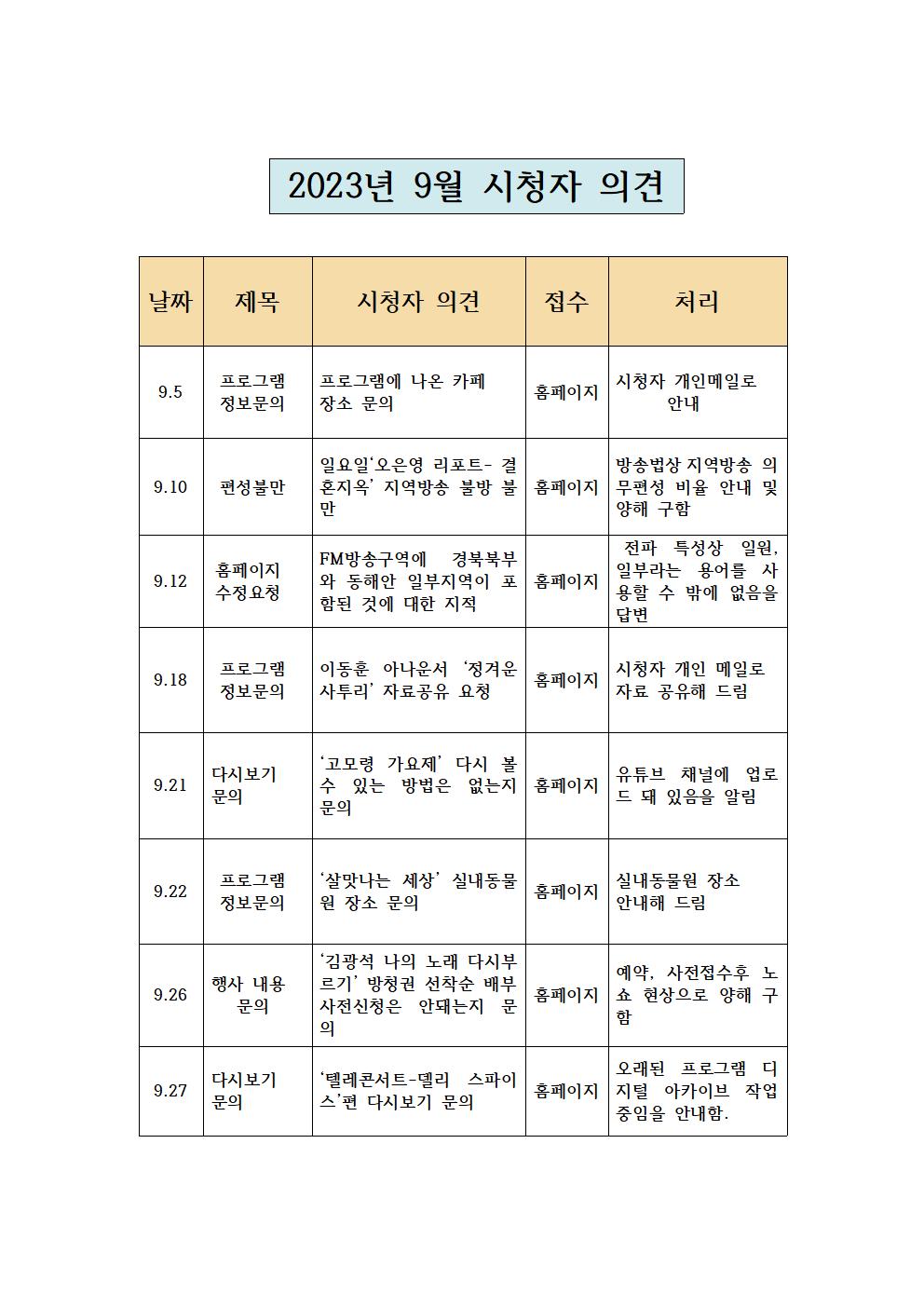 2023년 9월 시청자 의견 접수 및 처리 현황
