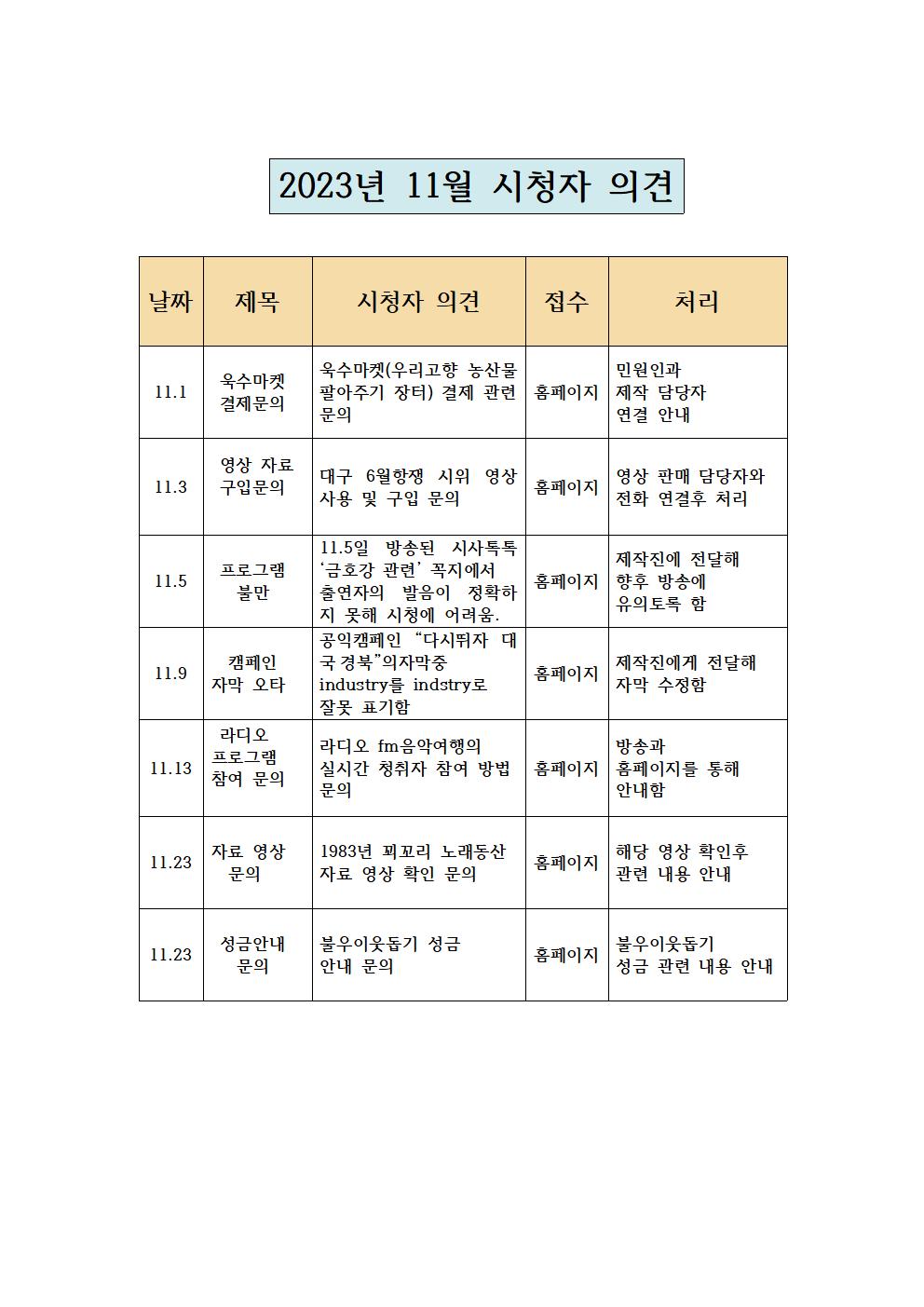 2023년 11월 시청자 의견 접수 및 처리 현황
