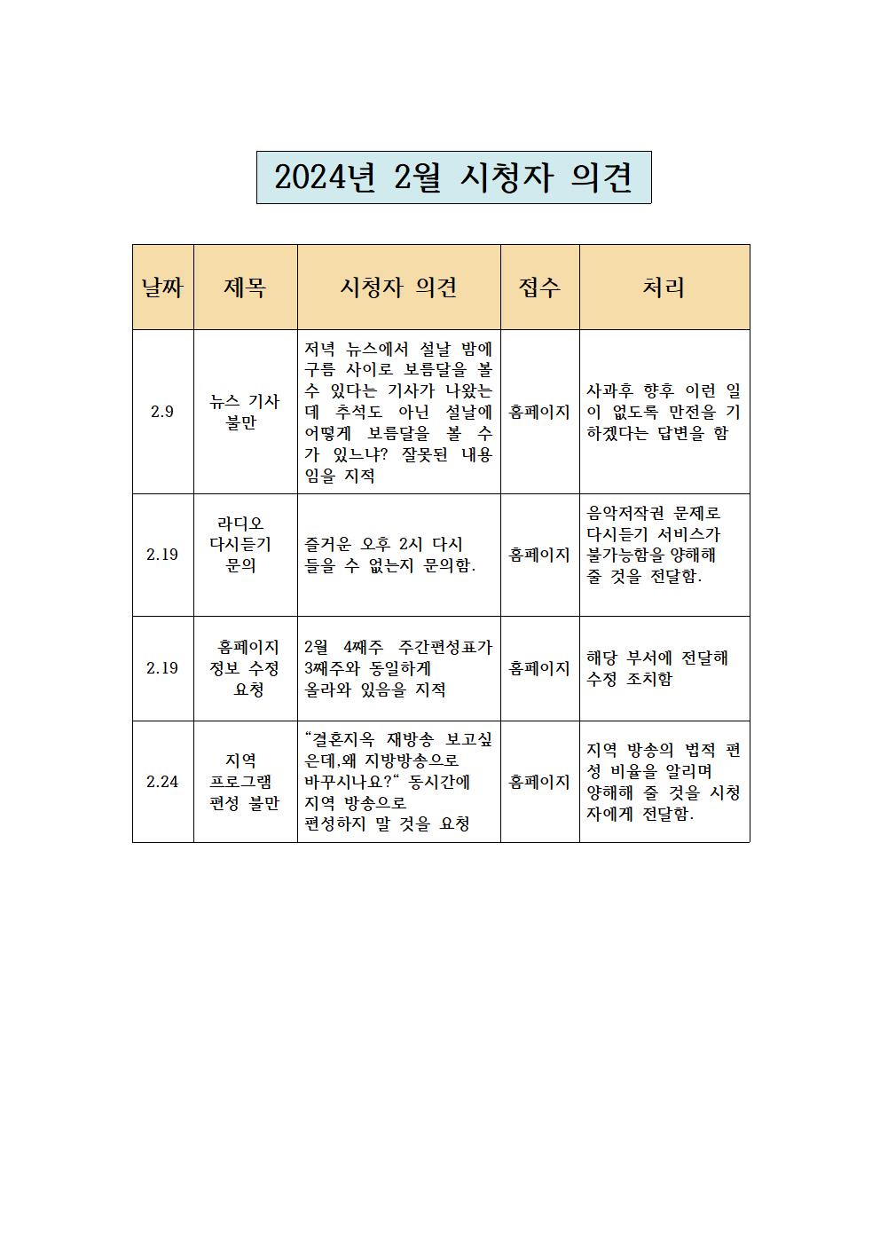 2024년 2월 시청자 의견 접수 및 처리 현황