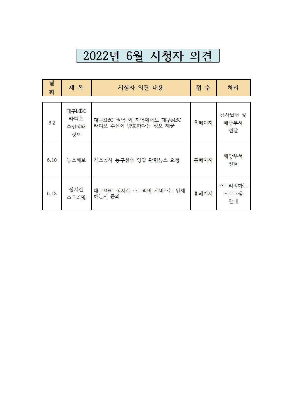 2022년 6월 시청자의견 접수 및 처리 현황