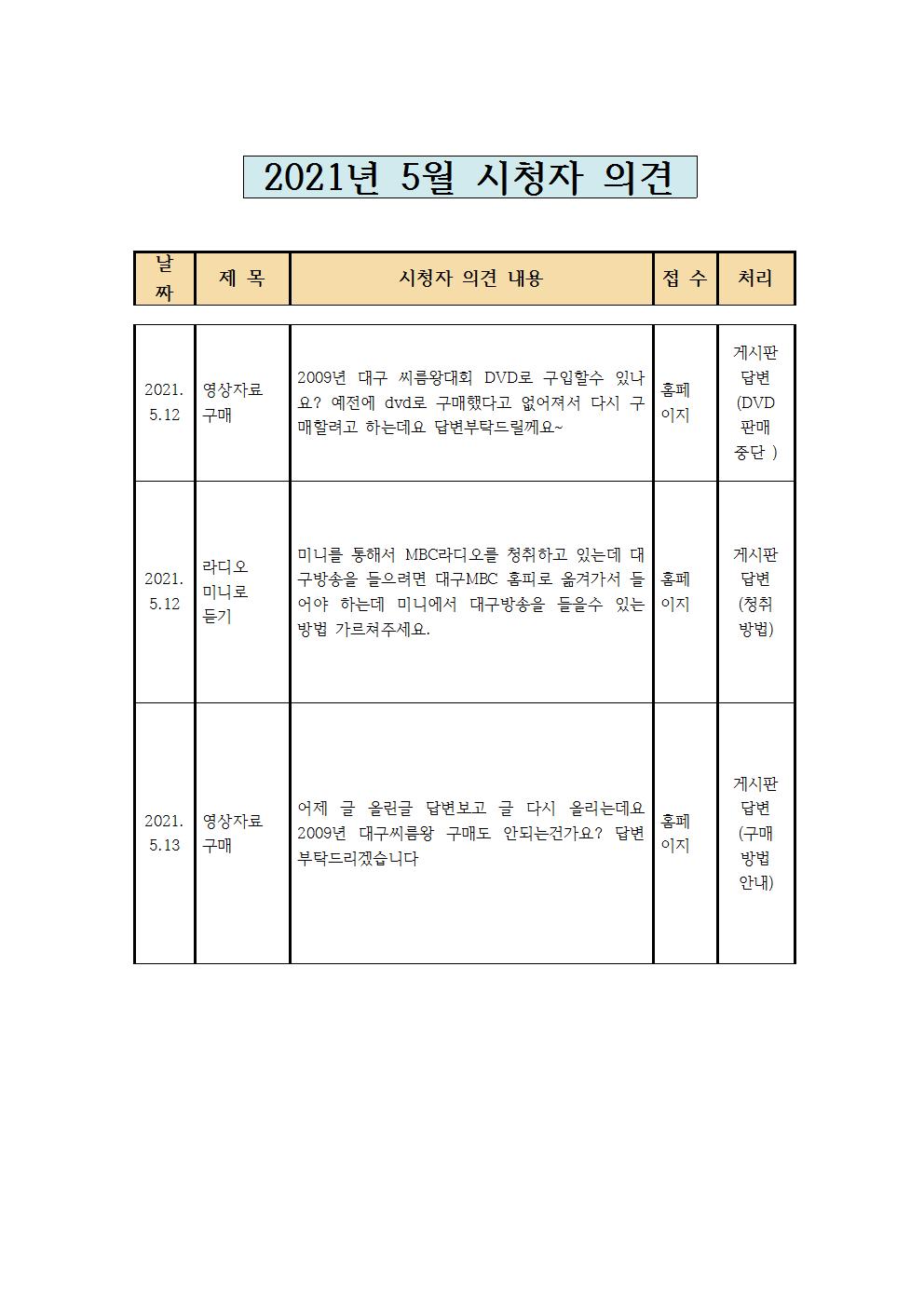 2021년 5월 시청자의견 접수 및 처리현황