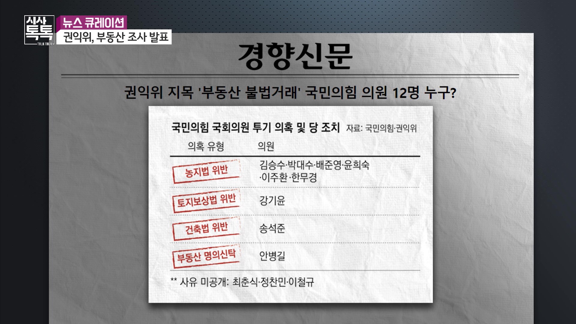 국민의힘 12명, 13건 의혹 중 대구에 주소지를 두고 평창에 농지를 사 일부만 경작해 해당 지자체에서 행정 처분 중인 한무경 의원을 비롯해 농지법 위반이 가장 많았고 명의신탁, 편법 증여 등이 있었고요.