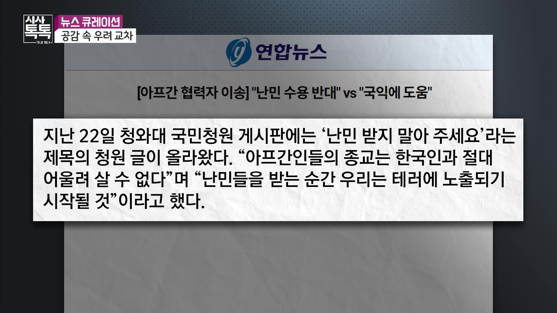 청와대 청원 게시판에는 아프간인의 종교는 한국인과 어울릴 수 없다, 난민을 받으면 테러에 노출된다며 반대 의견이 올라왔는데요. 3년 전 예멘 난민 때도 같은 이슈가 있었지만 아무 문제가 없었다면서 편견에서 비롯된 기우라는 지적도 있습니다.