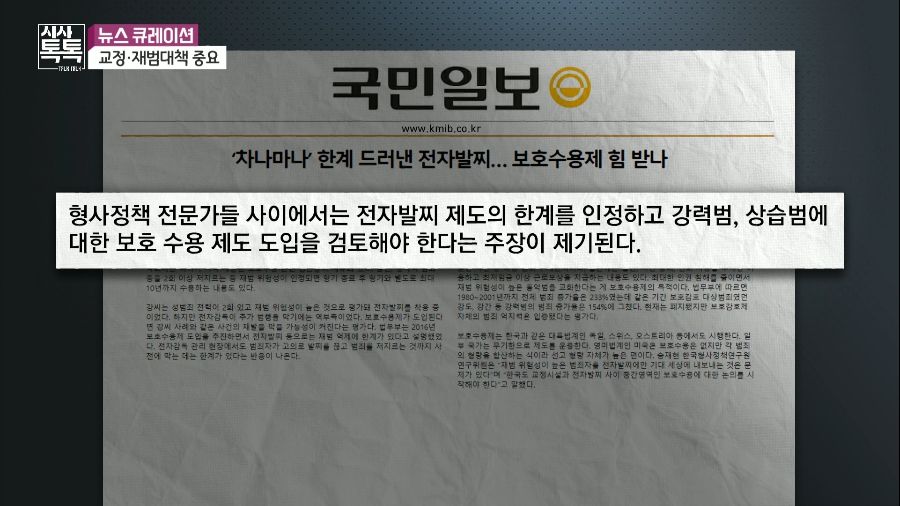 강 씨는 만 17세부터 20여 년간 8차례 복역과 출소를 반복하면서 만성적 범죄자가 됐는데요. 재범 방지가 핵심인 수감 중 교정 기능이 무용지물이었다는 지적과 함께, 일부 형사정책 전문가들은 전자발찌 한계를 인정하고 보호수용제도를 도입해야 한다는 의견을 내기도 합니다.