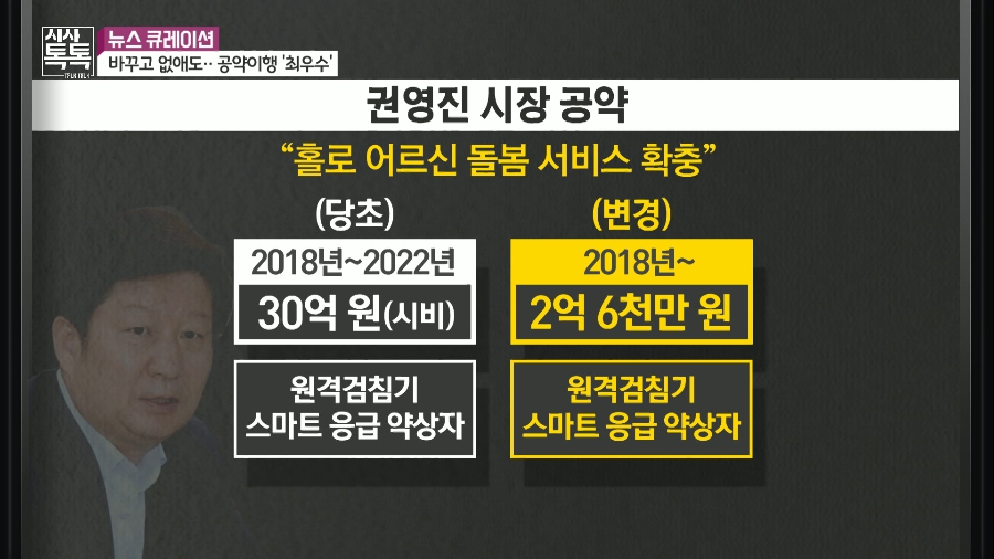 권 시장은 2018년 선거 당시 홀로 어르신 돌봄 서비스에 2022년까지 30억 원을 들이겠다고 했지만, 2018년 2억 6천만 원 쓴 것에 그쳤고요.
