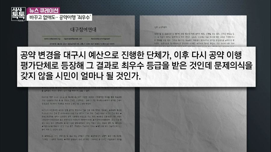 대구참여연대는 공약 변경을 위한 시민평가단 회의 수당과 구성 운영에 시 예산 2천 500만 원이 잡혀있는데, 공약 변경 회의를 대구시 예산으로 진행한 단체가 공약 이행 평가 단체였다는데 문제를 제기하고 있습니다.