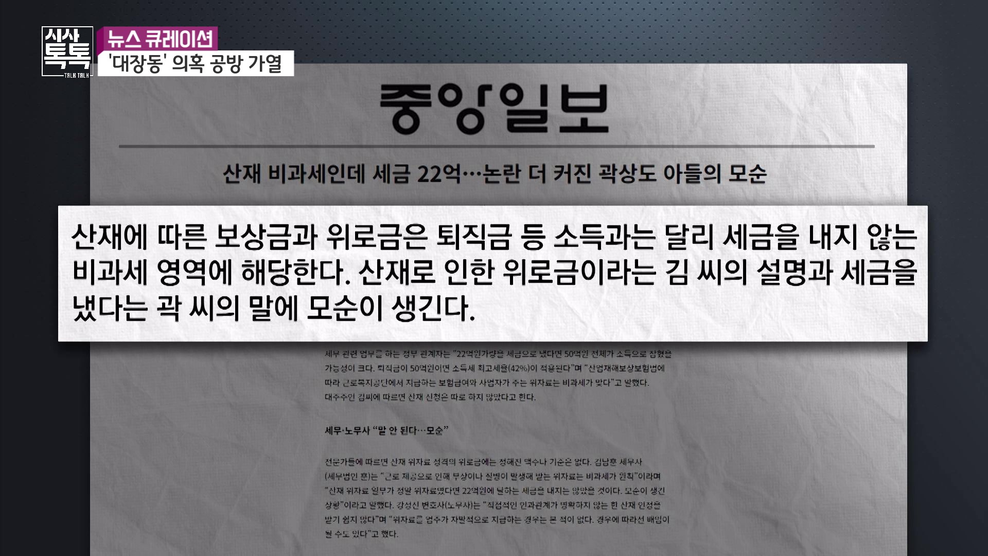 또, 산재보상금은 비과세거든요. 50억에서 22억 세금 떼고 28억을 계좌로 받았다는 해명에 대해서 결국에는 산재였으면 내지 않았을 세금 22억을 낸 건,소득세 최고세율이 적용된 것으로 보인다는 보도들이 있었고요.