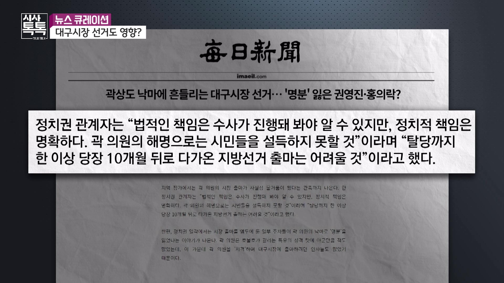 또 다른 언론은 권 시장이 가장 큰 반사이익을 얻는 것처럼 보이지만 강력한 후보였던 곽상도 의원 자리를, 대구를 지역구로 둔 현역 의원과 지역 출신 인사들까지 여러 인사가 목표하면서 여러 인사들이 물망에 오를 것이라는 전망을 내놨습니다.
