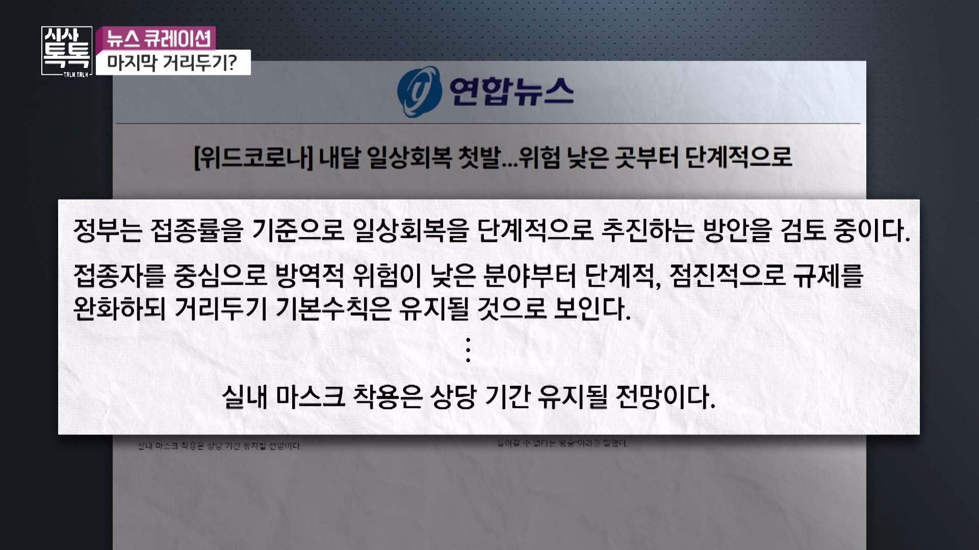 접종자를 중심으로 방역적 위험이 낮은 분야부터 단계적, 점진적으로 규제를 완화하되 거리두기 기본 수칙, 실내 마스크 착용은 상당 기간 유지될 것이란 전망이 있습니다.