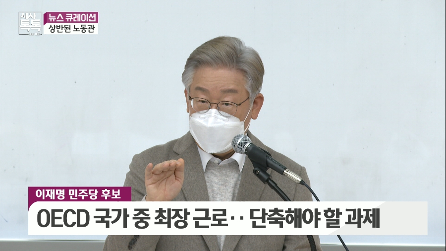 이재명 더불어민주당 대선 후보는 우리나라 노동시간이 여전히 OECD 국가 중 최장에 해당되고, 52시간도 잘 안 지켜진다며 장기적인 과제로 단축해야 한다는 입장을 밝혔습니다.
