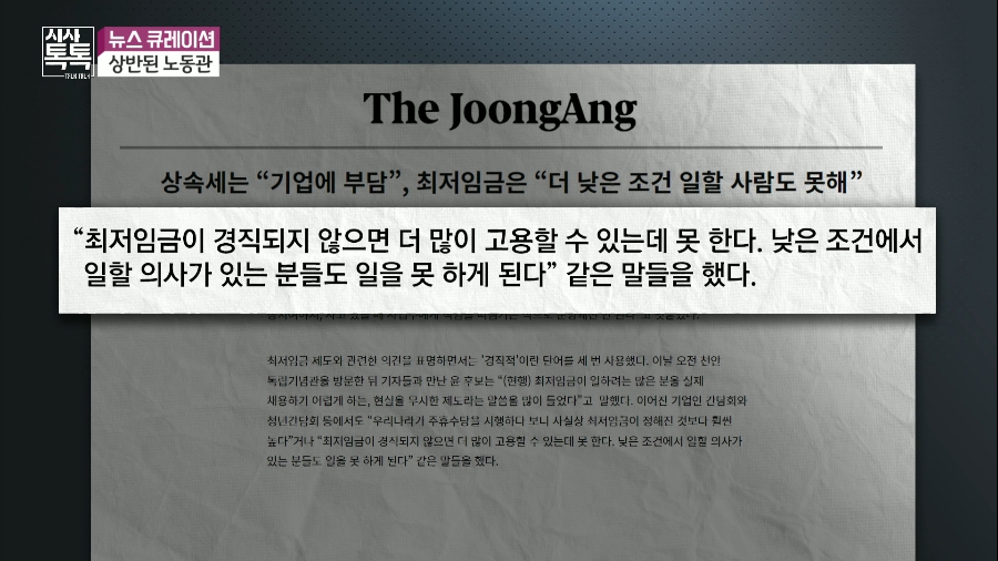 최저임금도 더 낮은 시급에도 일할 사람 있다더라면서 주 52시간, 최저임금은 비현실적, 경직적이라 기업 운영에 어려움이 많다고 말했고요.