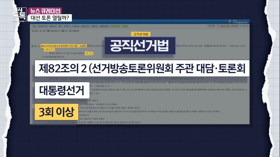 지난 대선, 탄핵으로 갑자기 맞은 대선이었음에도, 선거 90일 전을 기준으로 보면 법정토론 세 번에 후보 간 협의에 따라 세 번해서 여섯 번의 토론이 있었는데요.. 그때보다 후퇴했다, 이런 지적도 있습니다.