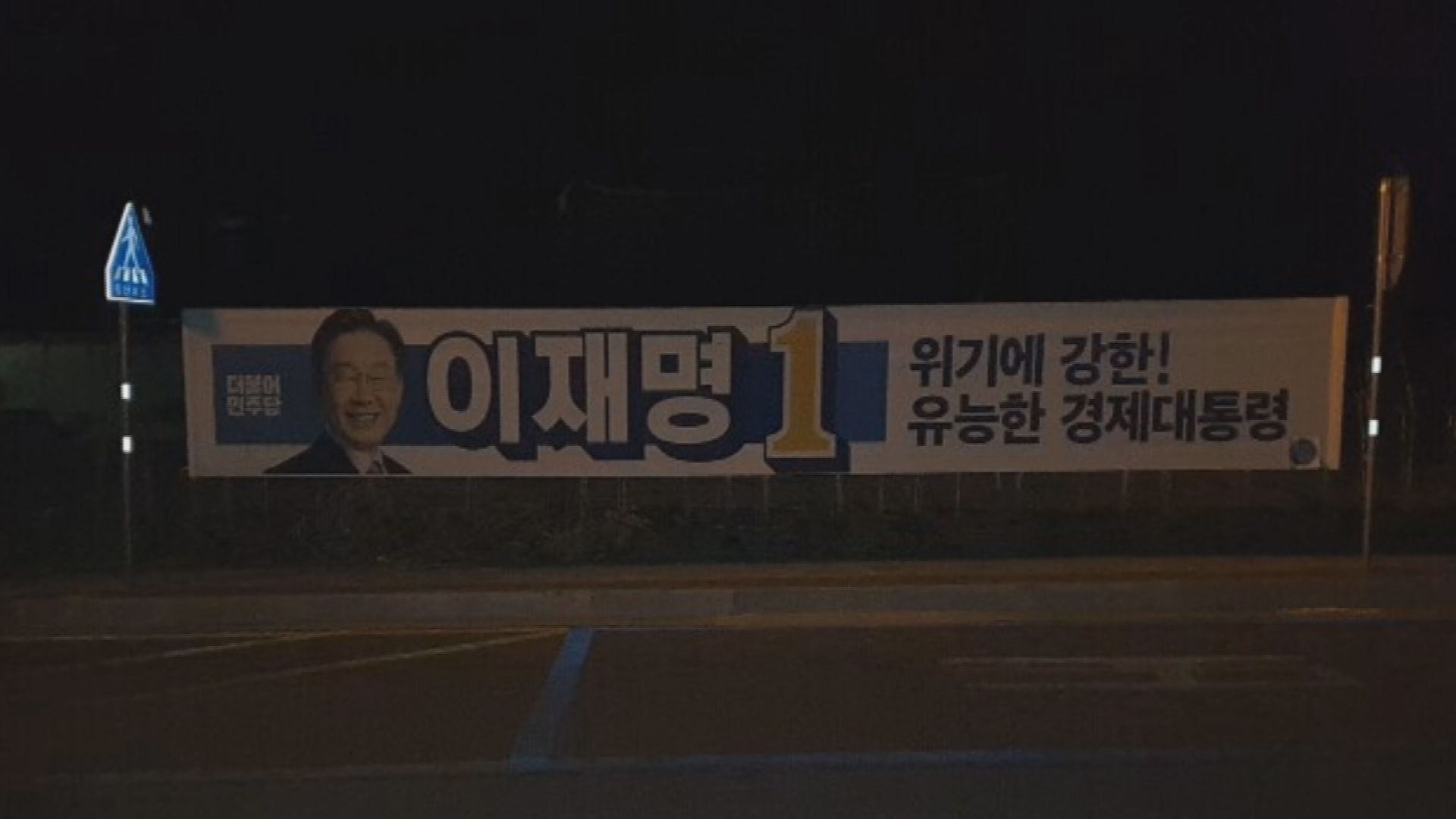 경찰은 2월 18일 오후 5시쯤 이재명 대선후보의 현수막이 줄이 끊긴 채 사라졌다는 신고를 받았고, 현재 CCTV를 분석해 용의자를 찾고 있습니다.