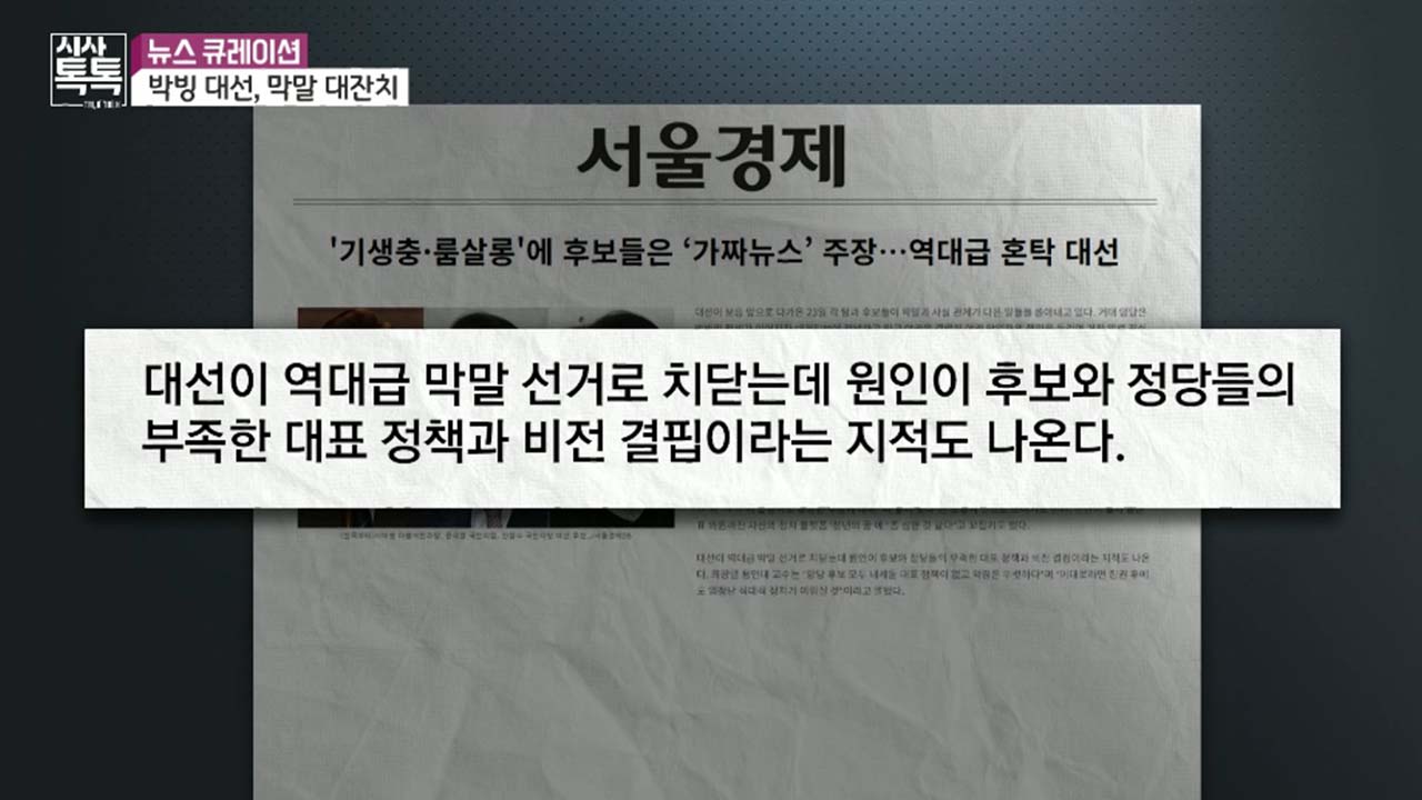 최창렬 용인대 교수는 "양당 후보 모두 내세울 대표 정책이 없고 약점은 뚜렷하다”며 "이대로라면 집권 후에도 엄청난 적대적 정치가 이뤄질 것”이라고 했습니다.
