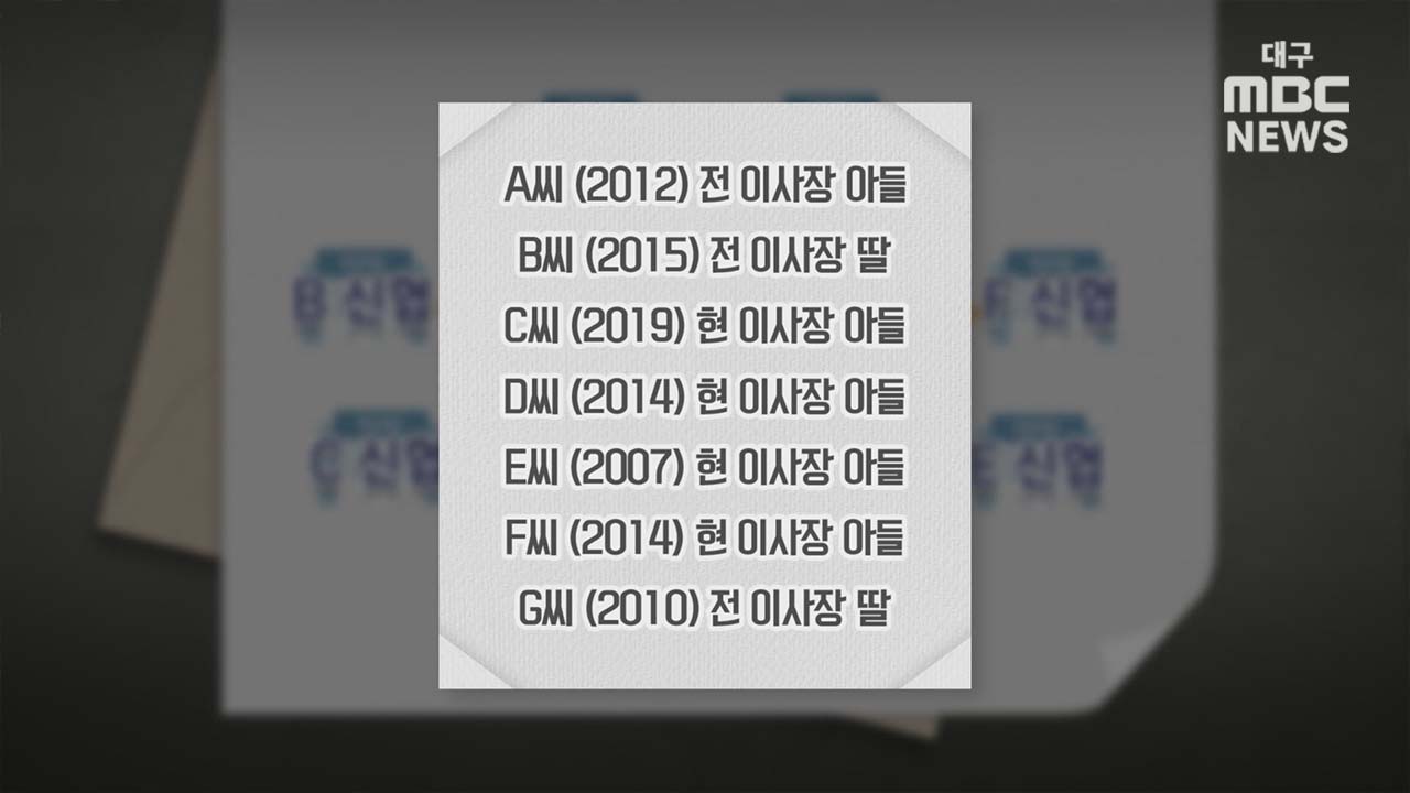 김 씨 아들이 '키'였습니다. 이들 7명이 채용된 시기에 김 씨 아들은 대구지역 신협 3곳에 채용돼 옮겨 다니며 근무를 했습니다. 각기 다른 신협 이사장들이 품앗이하듯 자기 자녀들을 서로 다른 신협에 채용한 셈입니다. 어찌 보면 김 씨 아들 채용을 대가로 이사장 김 씨가 다른 이사장들 자녀를 뽑아준 것으로도 보입니다. 각 신협은 독립된 법인으로 따로 채용하고 최종 면접에는 이사장이 면접관으로 들어갑니다. 이 신협 전 임원은 "김 씨가 이사장이 되기 전부터 채용부터 모든 관리까지 실제 결정은 김 씨가 다 했다"라고 밝혔습니다. 또 아버지가 이사장인 직원들은 연봉 계약 등에서 혜택을 받았다는 주장도 나왔습니다. 이 신협의 한 직원은 "이사장 자녀 누구가 들어오면 바로바로 소문이 날 정도"라며 이사장 자녀들을 향한 특혜가 많다고 설명했습니다.