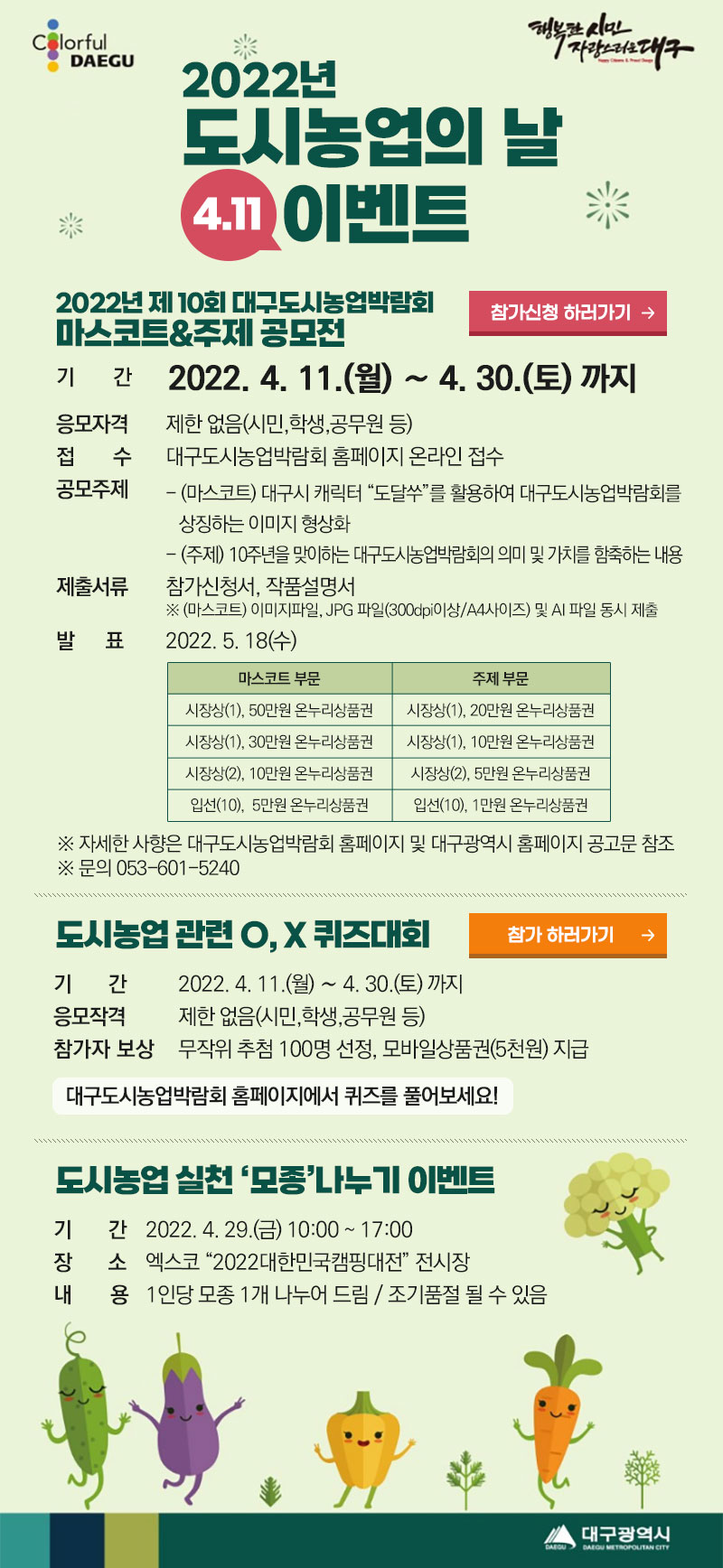 대구시는 도시농업의 날을 맞아 도시농업을 널리 알릴 수 있는 '마스코트'를 정하기 위해 공모전을 엽니다.