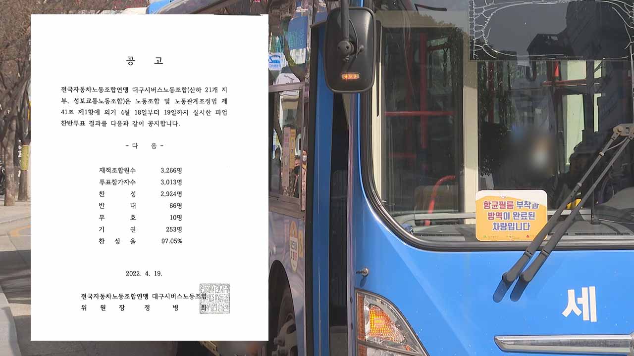 전국 자동차 노동조합 대구 시내버스 노동조합은 총파업 찬반 투표 결과, 97.05% 찬성률로 파업 안을 가결했다고 밝혔습니다.