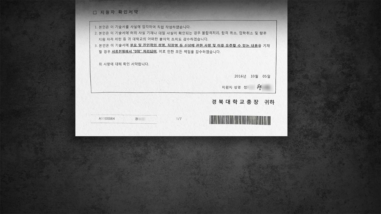 그런데 이 서명의 필적이 2016년 10월, 딸이 경북대학교 의과대에 편입하기 위해 제출한 자기 기술서의 서명과 완전히 다릅니다.