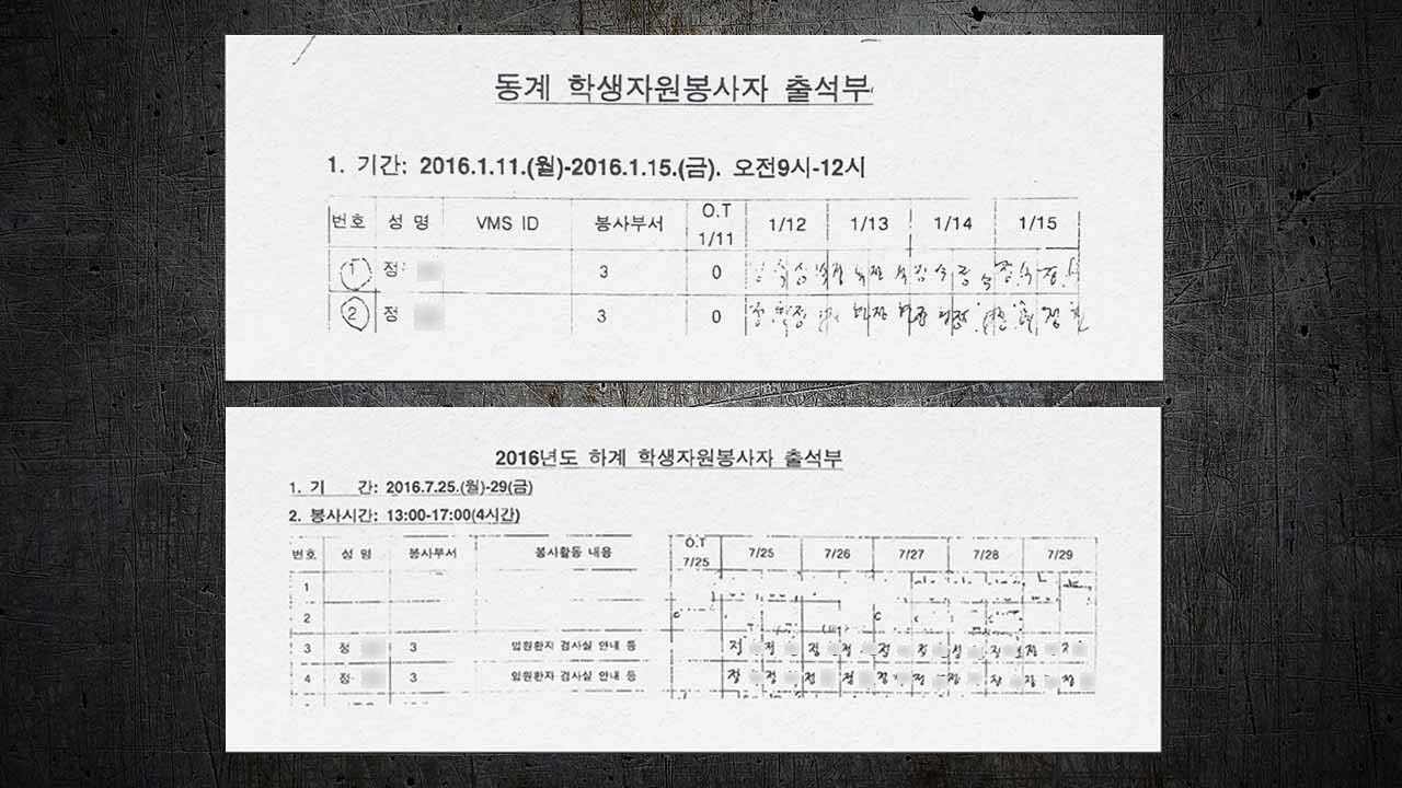 더불어민주당 강선우 국회의원실이 경북대학교 측으로부터 제출받은 정 후보자 딸과 아들의 2016년 학생자원봉사자 출석부를 취재진이 확인한 결과 이 같은 사실이 드러났습니다.