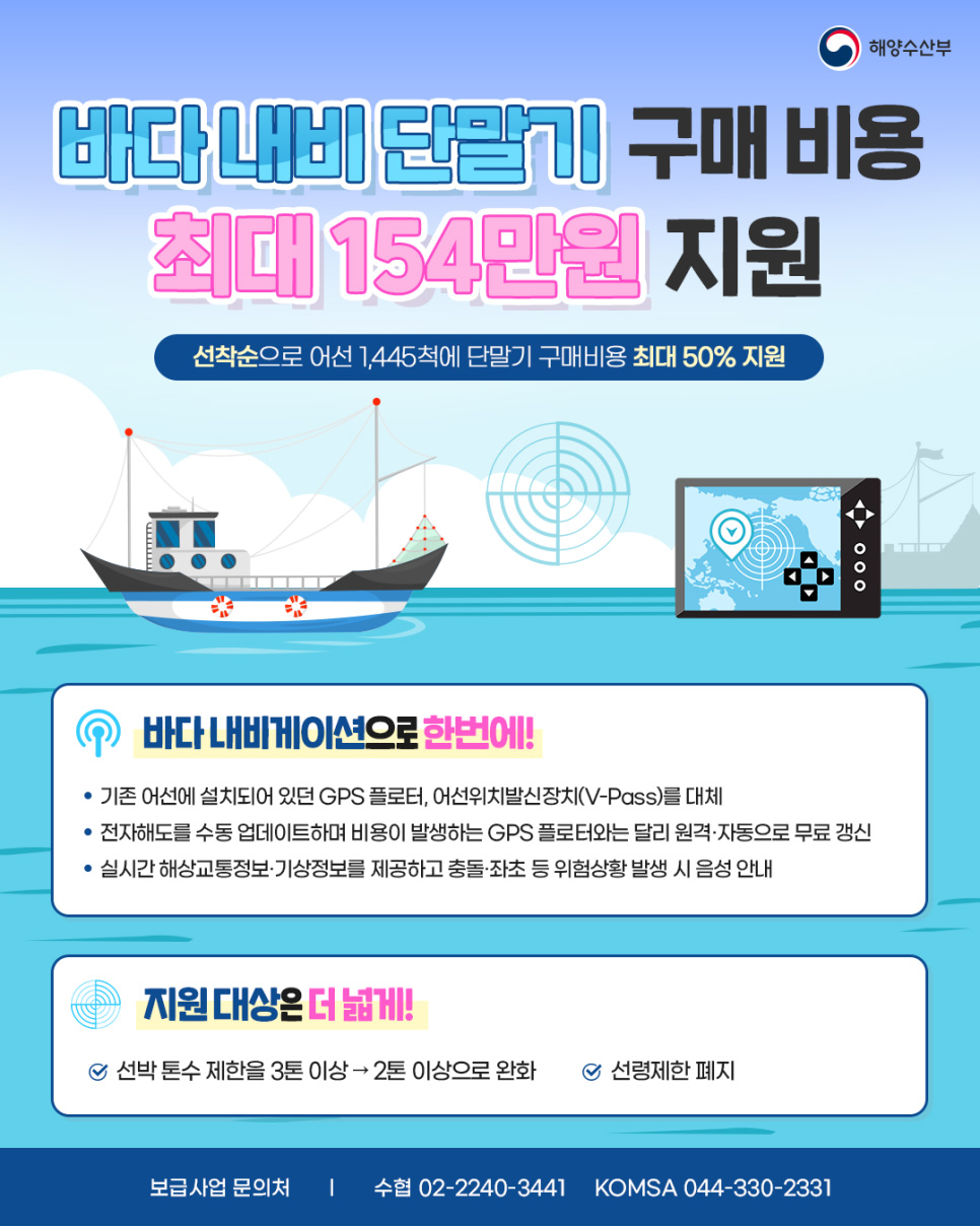 신청하는 어선에 대해 바다 내비게이션 단말기 구입자금의 절반인 최대 154만 원까지 지원합니다.