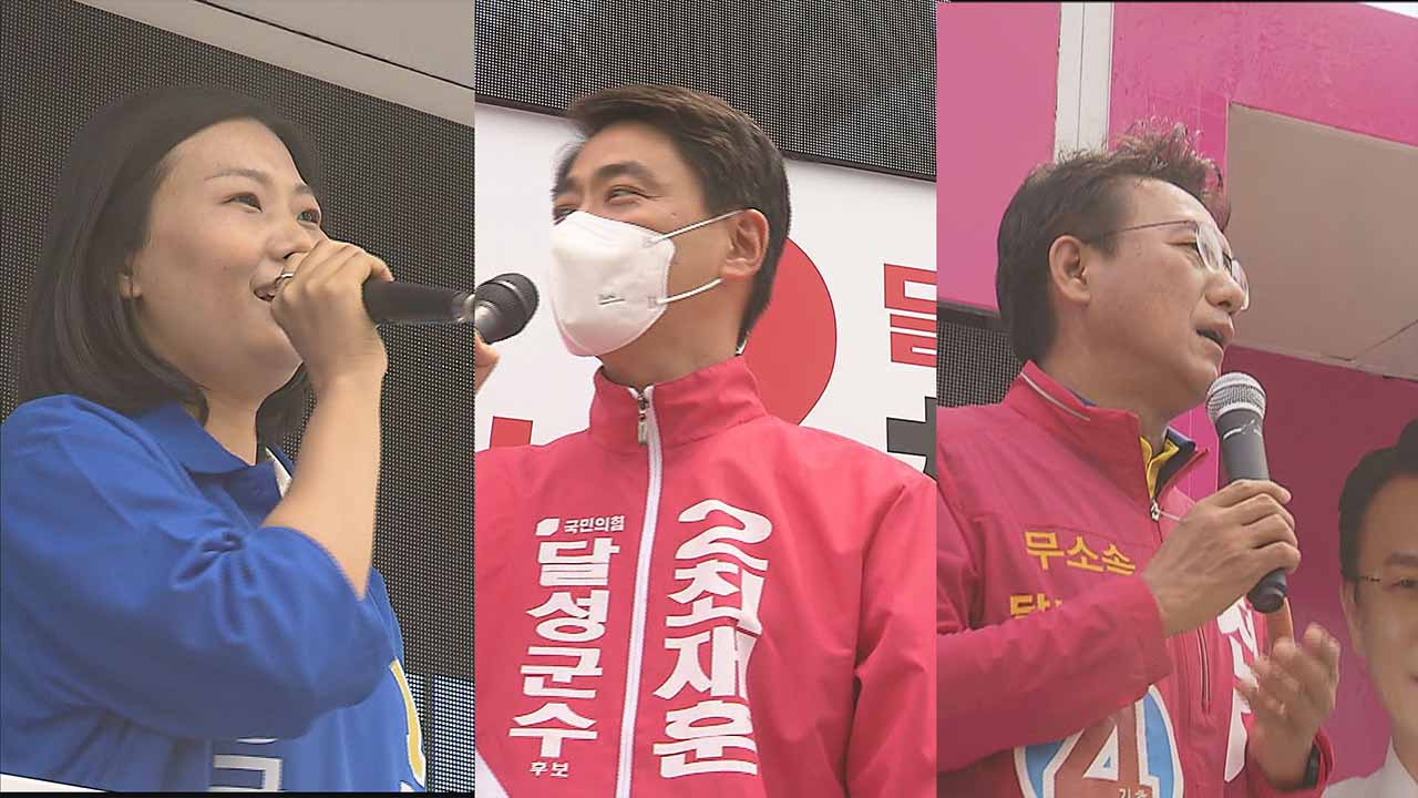 달성군수 선거에는 더불어민주당 전유진, 국민의힘 최재훈, 무소속 전재경 3명의 후보가 출마해 3파전으로 치러지고 있습니다.