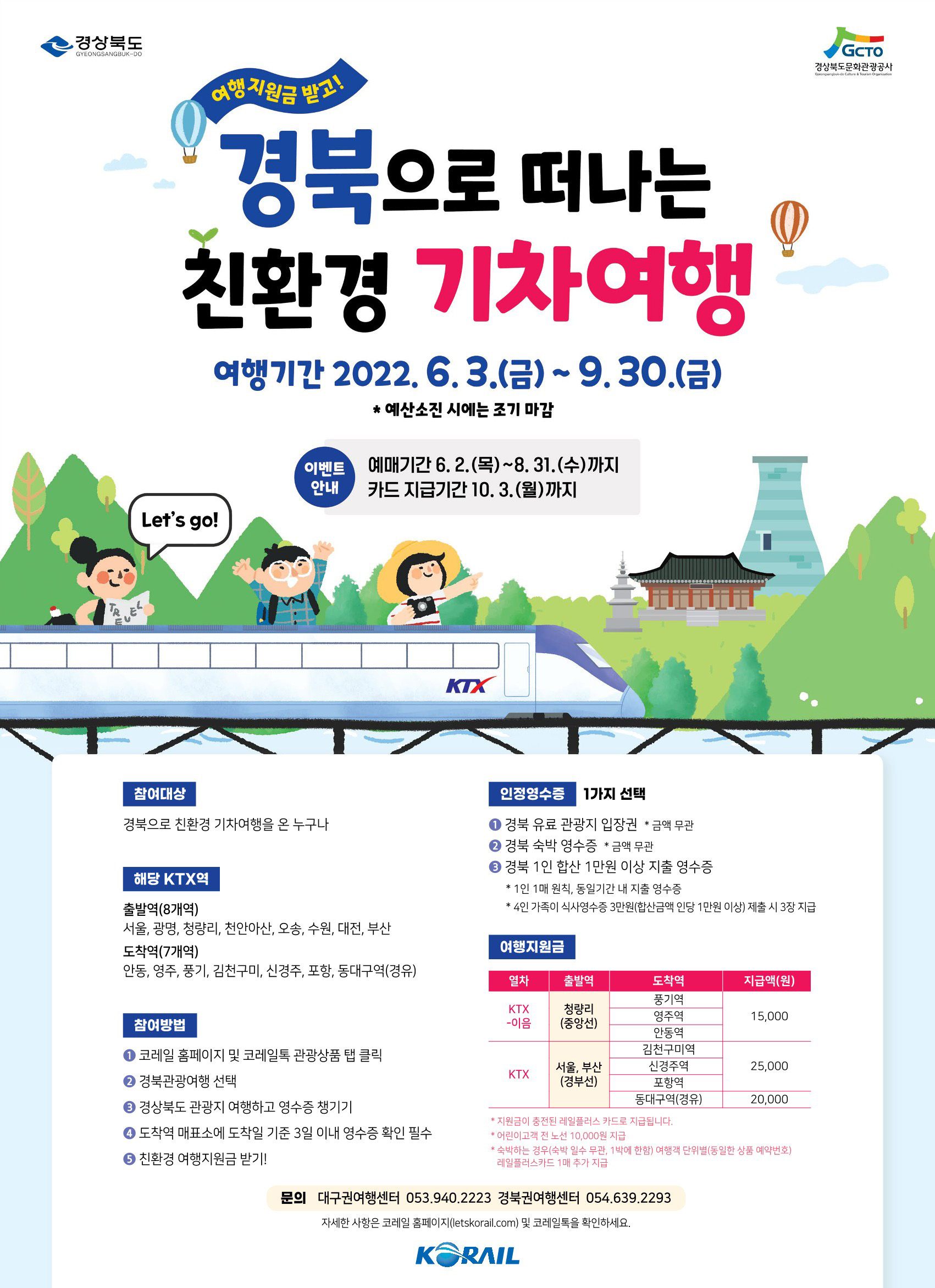 경상북도는 한국철도공사와 연계해 '경북으로 떠나는 친환경 기차 여행’ 프로그램을 만들어 KTX를 타고 지역을 찾는 여행객들에게 여행지원금을 줍니다.