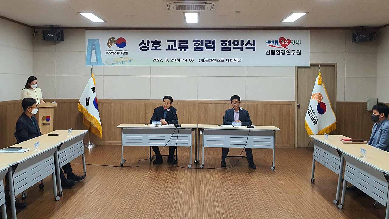경상북도 산림환경연구원과 재단법인 문화엑스포가 교류 협력에 관한 협약을 했습니다.