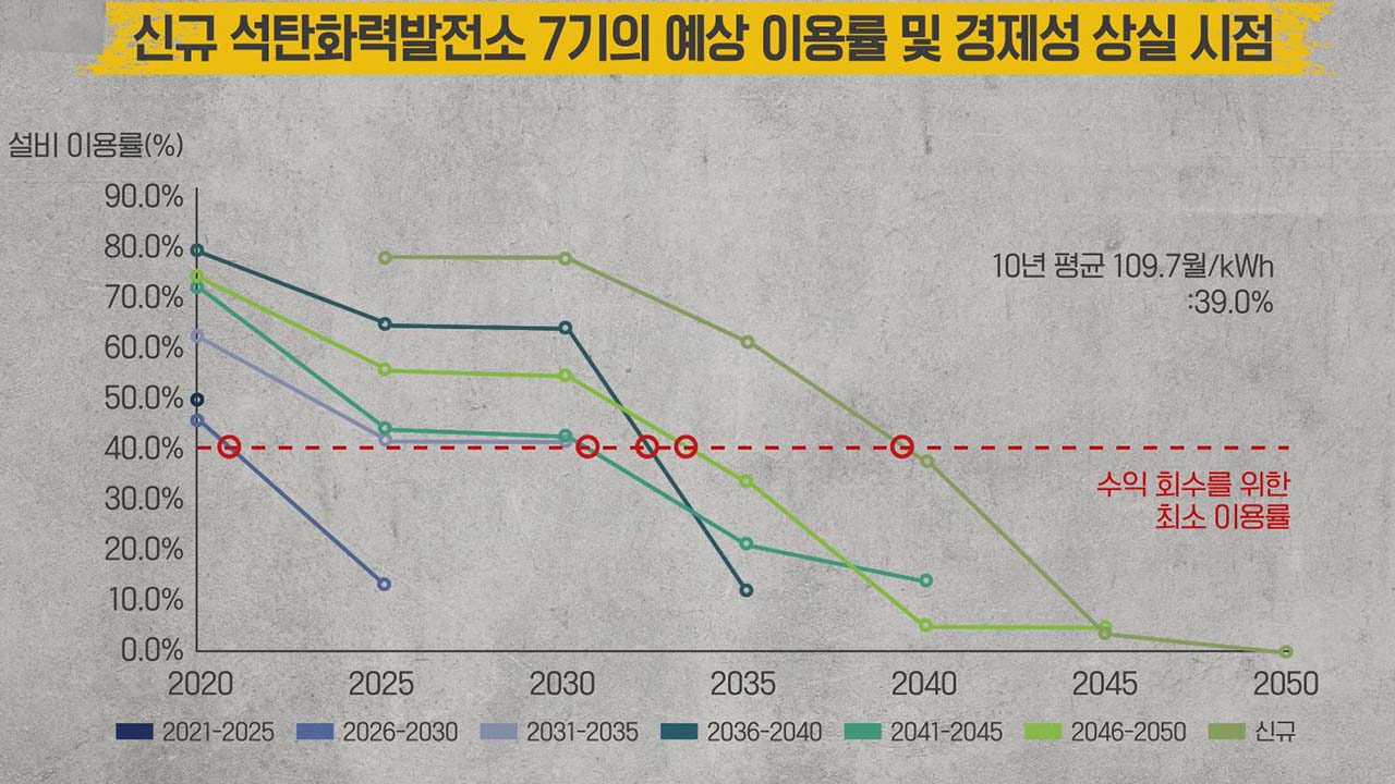 현재의 온실가스 규제와 재생에너지 목표만 따르더라도 기존 석탄 발전소는 물론 현재 건설되고 있는 발전소 역시 2040년 이후 이용률이 절반 이하로 떨어질 것이라는 예상이 나오고 2050년에는 석탄 화력발전소의 경제성이 아예 상실되기 때문에 문을 닫아야 할 가능성이 높습니다.