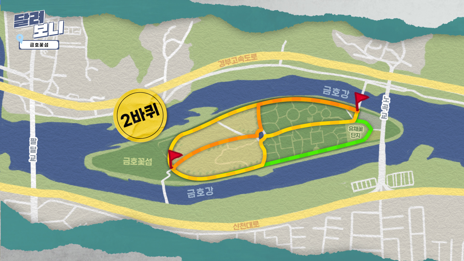 그런 이유에서 이번 코스, ‘하중도(금호꽃섬)’의 선택은 필연적일지도 모르겠습니다. 크게 섬을 한 바퀴 돌 순환과 섬의 끝에서 끝, 혹은 섬의 양 끝에 있는 다리와 같은 기준점을 둔 직선코스까지, 또 그사이를 왕복하거나 다른 방향으로 확 달릴 수 있는 지점 등 다양한 형태의 ‘자유로운’ 코스가 가능하다는 거죠. 그리 크지 않은 섬이기에 여러 방식으로 뛰어도 금방 출발 지점에 이를 수 있습니다. 직선이나 순환과 같은 다름을 품은 러닝은 어쩌면 비대면 방식의 러닝에서만 가능한 재미일지도 모릅니다. 그 다름을 바탕으로 자유로움을 느낄 수 있습니다. 코로나19로 인한 어려움이 많았던 시기가 다른 의미에서는 러닝의 새로운 재미와 가치를 찾는 기회로 자리했다고 볼 수도 있다는 거죠.