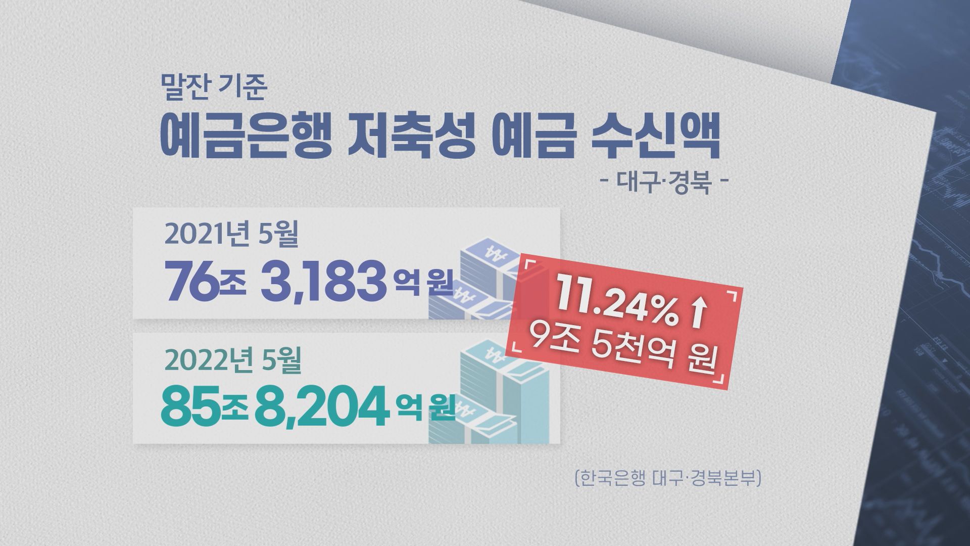 한국은행 대구·경북본부에 따르면, 지난 5월 대구와 경북지역 예금은행의 저축성 예금 수신 잔액은 85조 8,204억 원입니다.