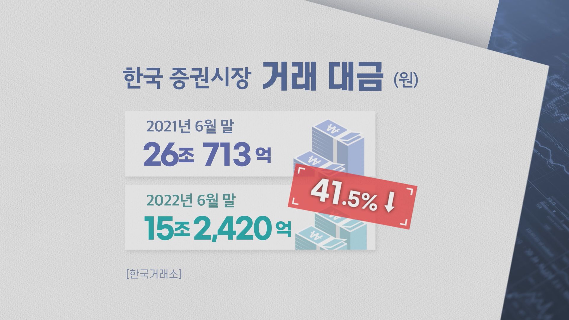 지난 6월 말 기준 주식 거래 대금은 15조 2천 420억 원으로 한 해전 26억 713억 원과 비교해 41.5% 감소했습니다.