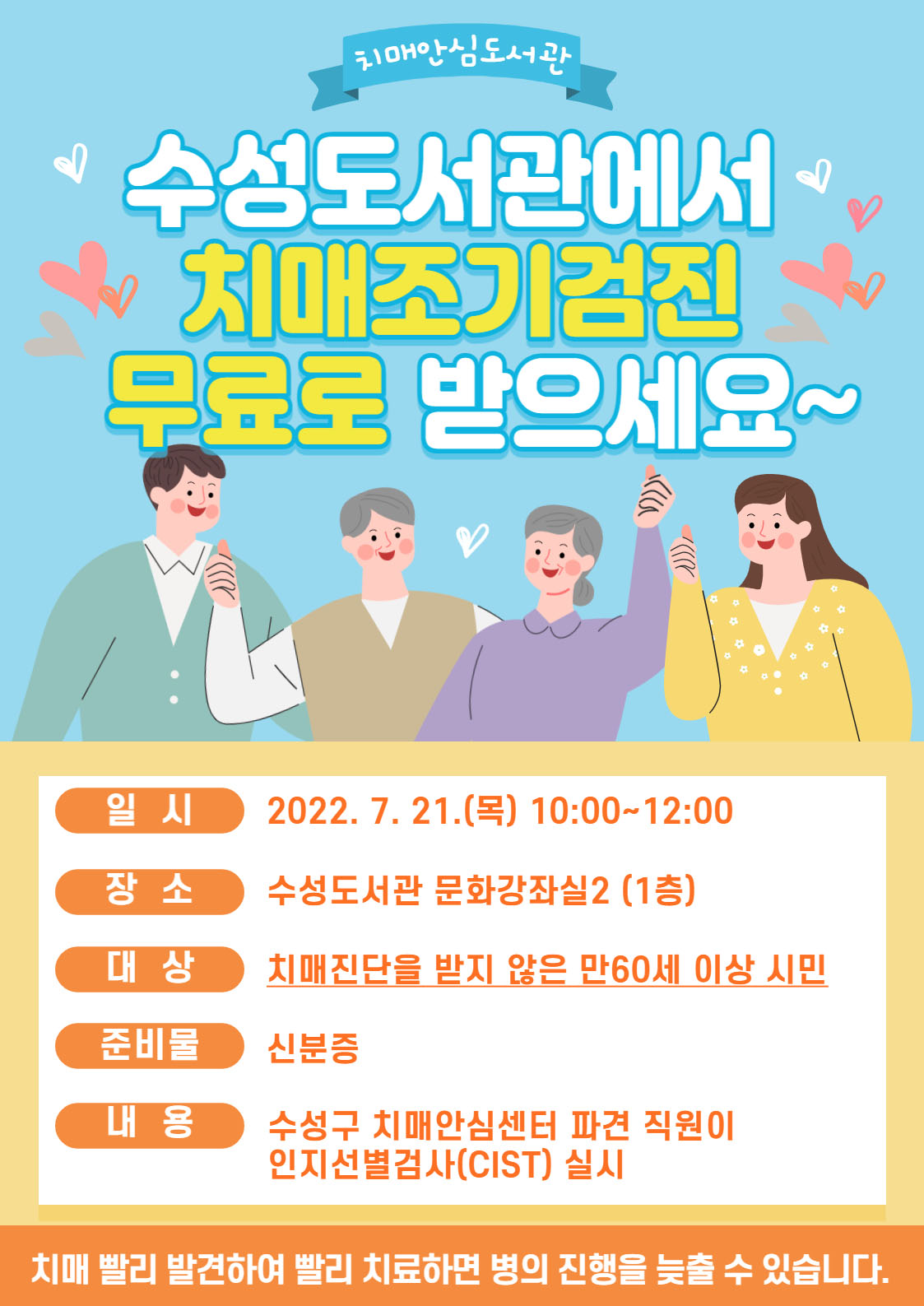 매월 셋째주 목요일 오전 10시에서 12시 사이에 수성도서관 1층 문화강좌실로 가면 인지 선별검사(CIST)를 받을 수 있습니다.