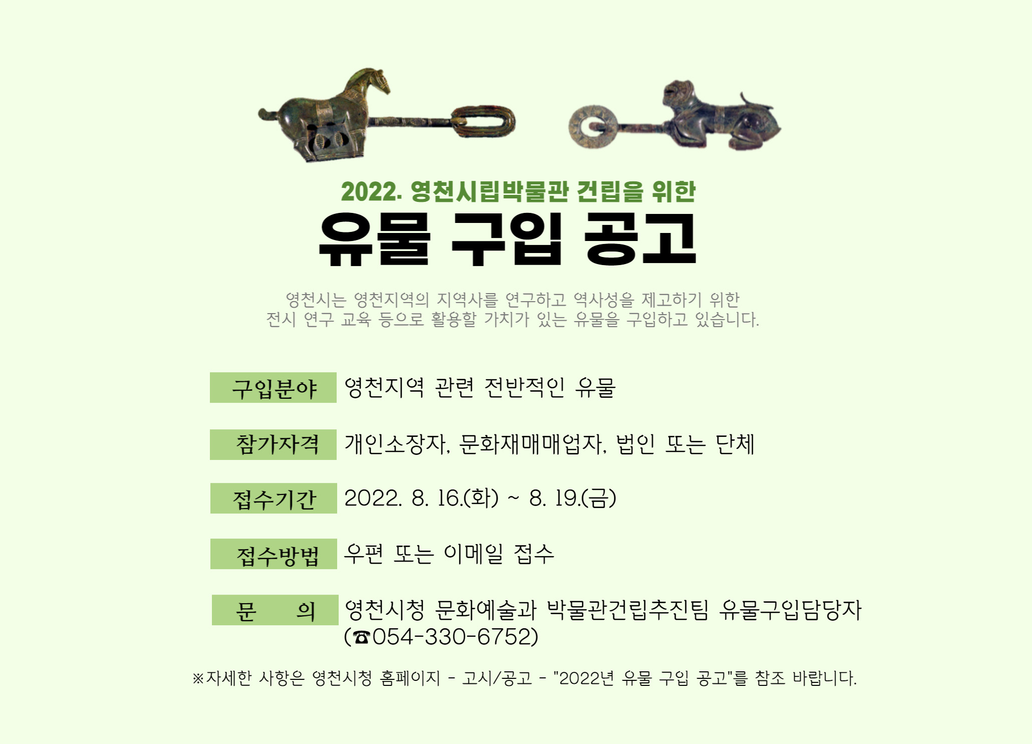 영천시가 시립박물관에 전시할 유물을 공개적으로 삽니다.