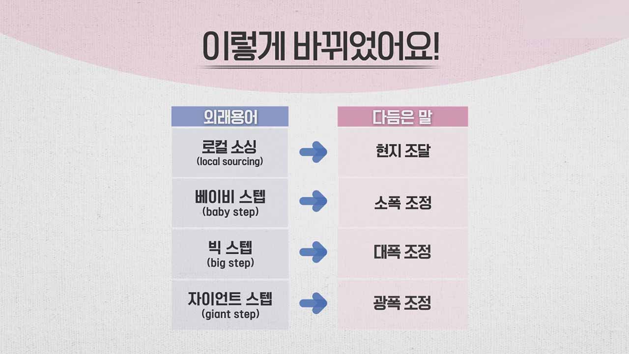 문체부와 국어원은 '로컬 소싱'은 '현지 조달'로, '베이비 스텝'은 '소폭 조정', '빅 스텝'은 '대폭 조정', '자이언트 스텝'은 '광폭 조정'을 선정하고 정부 부처와 언론사를 상대로 홍보에 나섰습니다