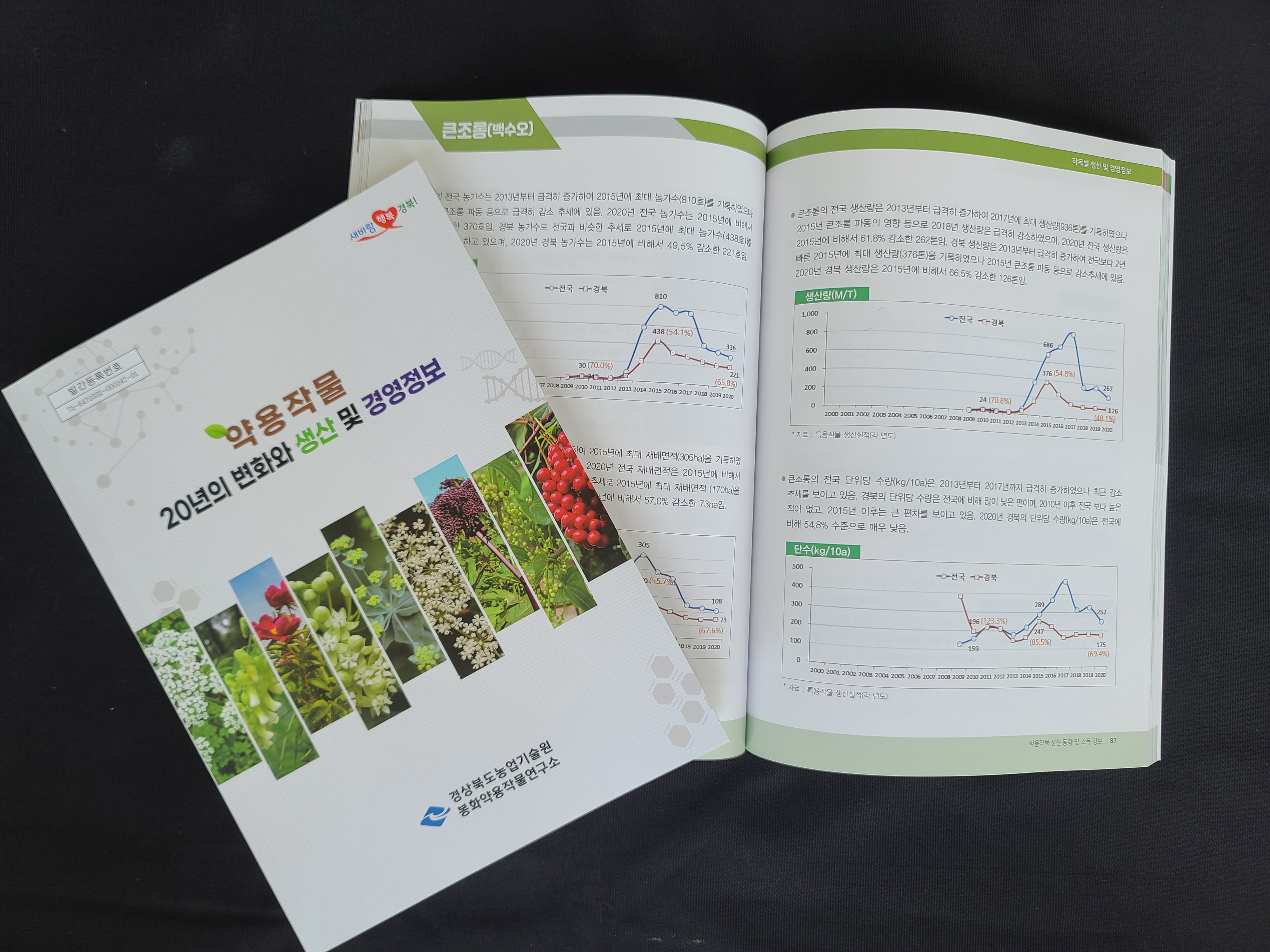 농촌진흥청과 시·군 농업기술센터, 농업기관 등에 배포한 이 책에는 오미자와 마, 참당귀, 천궁 등 경북에서 가장 많이 재배되고 있는 18개 약용작물에 대한 20년간의 생산량, 가격, 소득 등의 내용이 들어 있습니다.