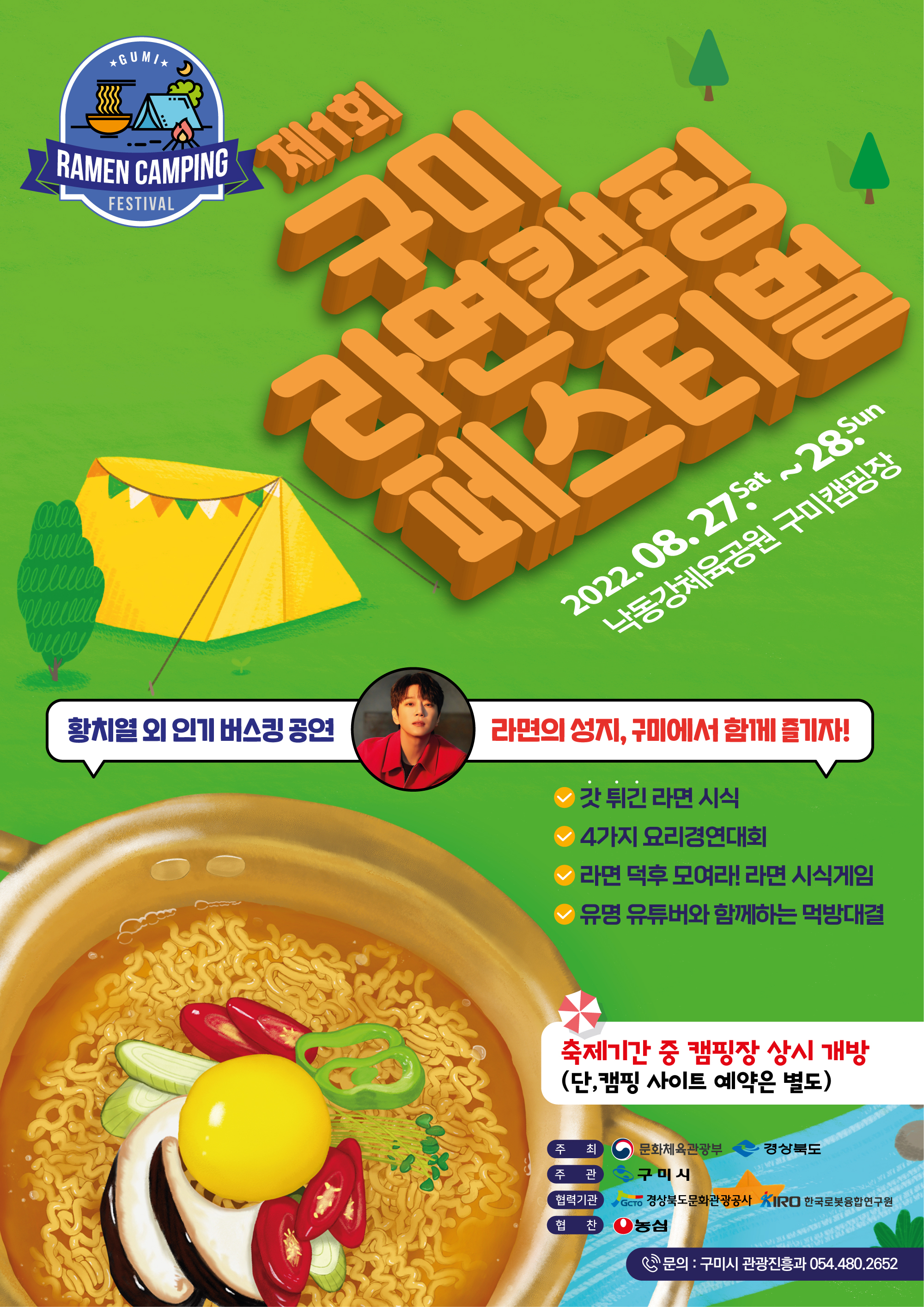 2022년 구미 라면 캠핑페스티벌이 8월 27일과 28일 낙동강체육공원 구미캠핑장에서 열립니다.