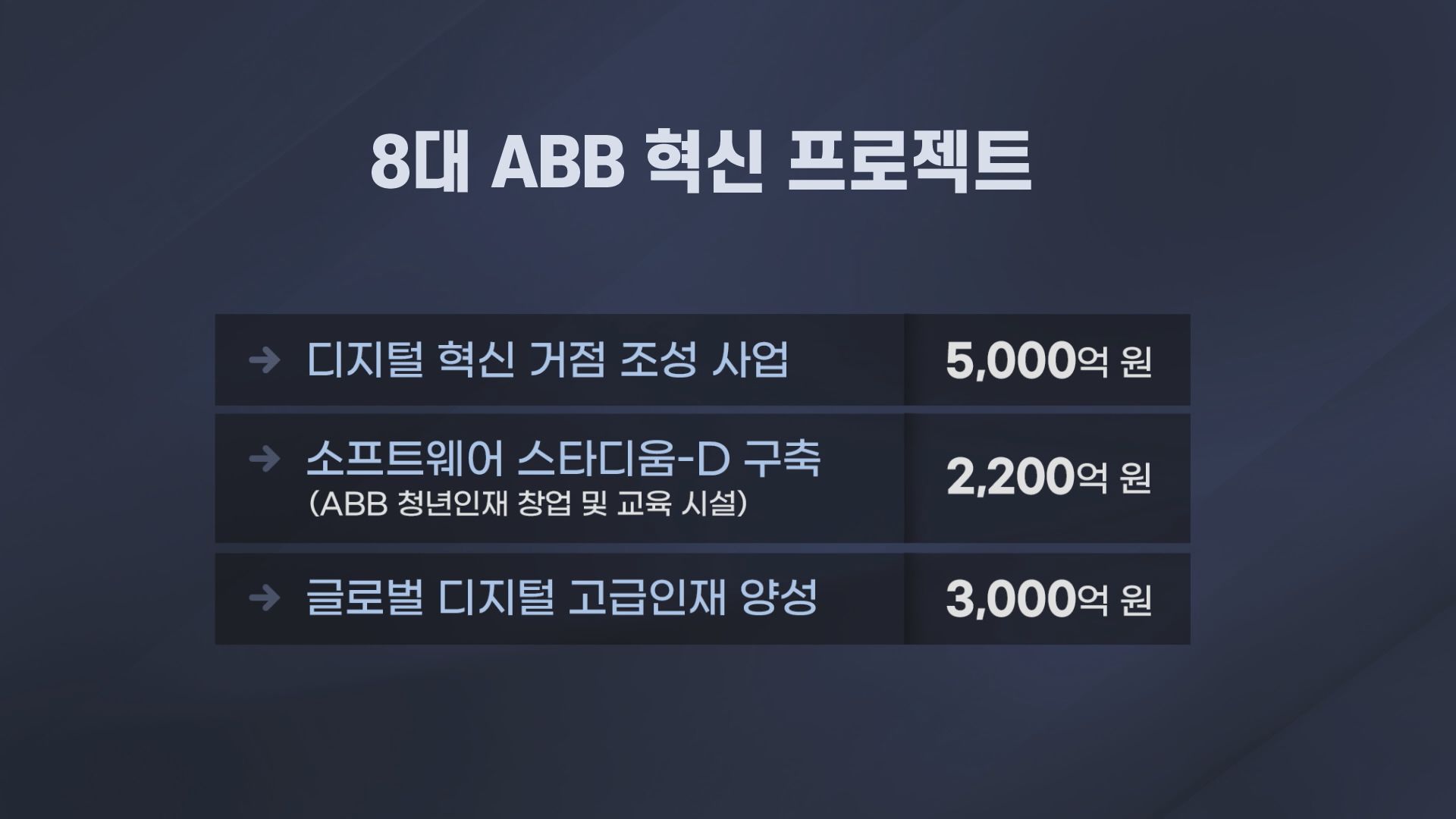 ABB 청년 인재 창업과 교육 시설 구축에 2,200억 원, 글로벌 디지털 고급 인재 양성에 3천억 원을 들입니다.