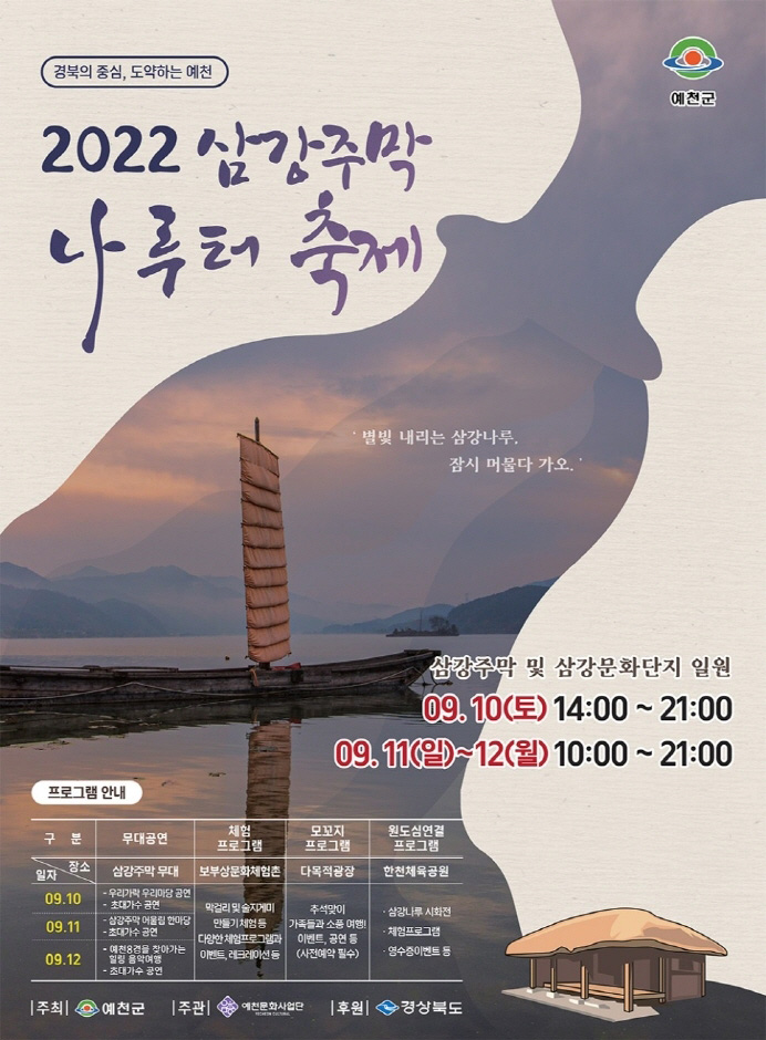 예천 '삼강주막 나루터 축제'가 9월 10일부터 12일까지 추석 연휴 기간 풍양면 삼강주막 일원에서 개최됩니다.