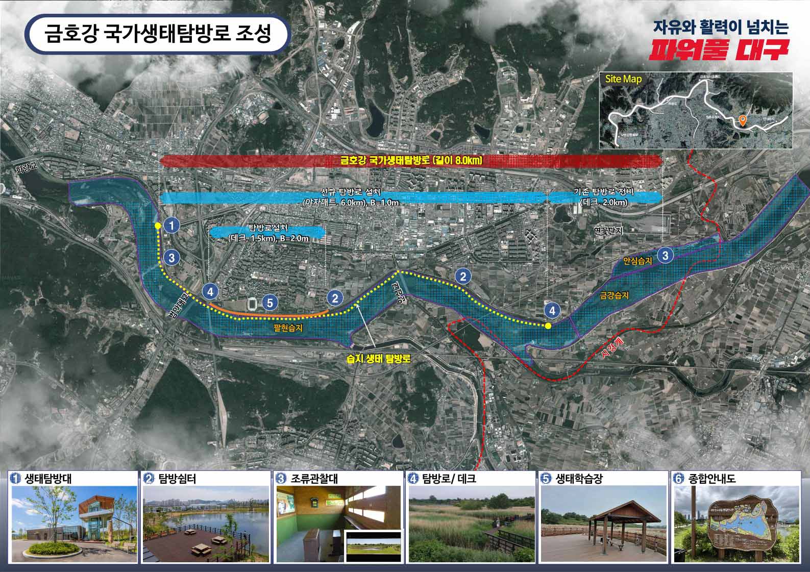 디아크 문화관광 활성화는 화원유원지와 달성습지를 연계해 금호강과 낙동강 합류부에 관광지를 만드는 것이고, 금호강 국가생태탐방로 조성은 안심습지와 금강습지, 팔현습지를 연계해 생태탐방로를 만드는 사업입니다.